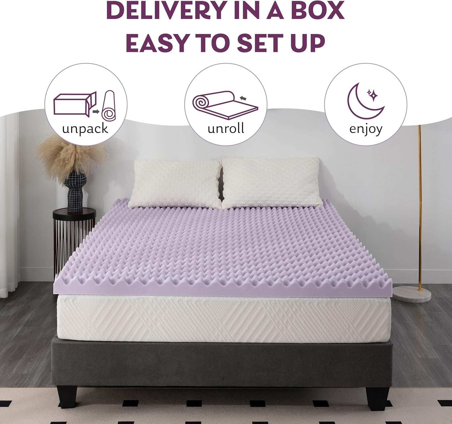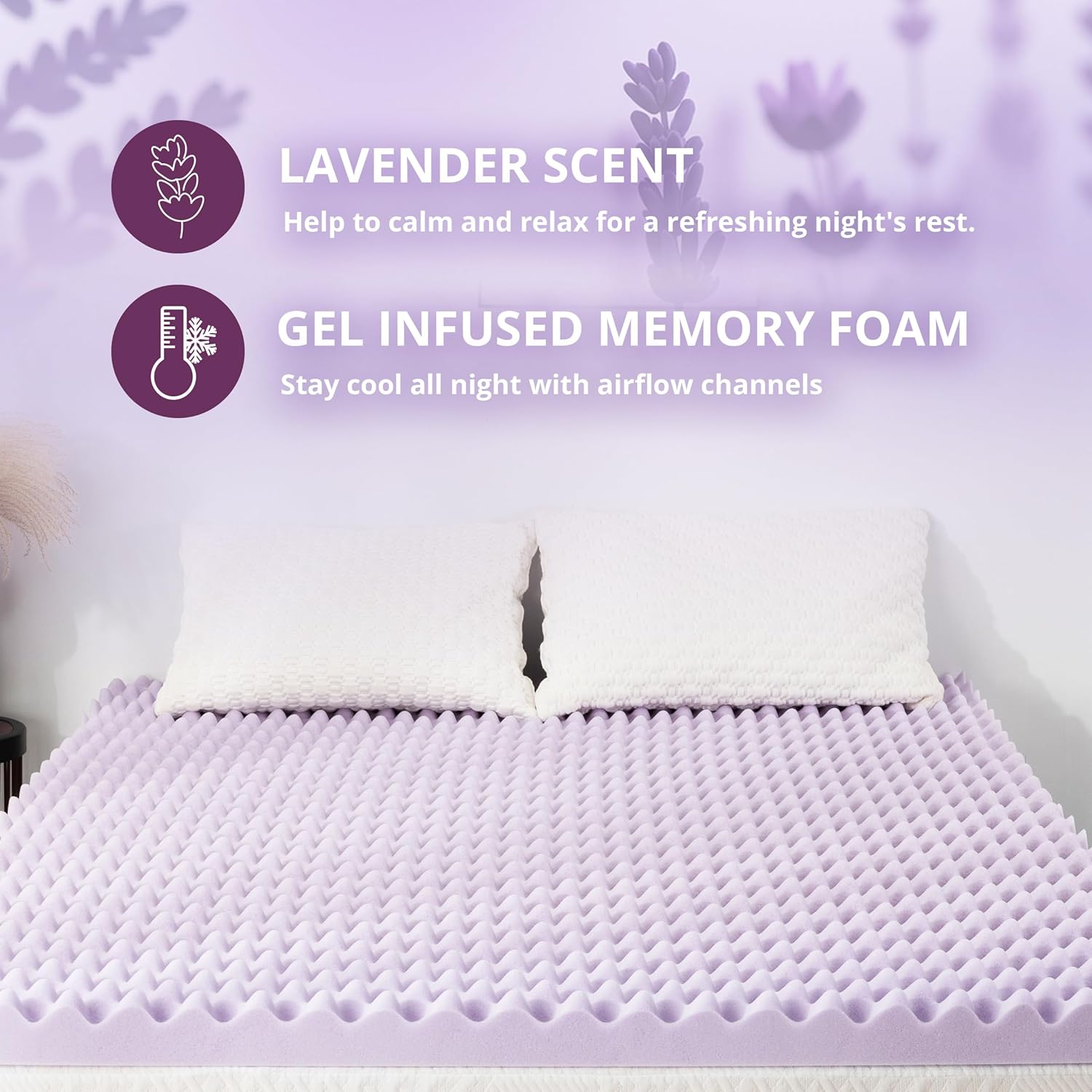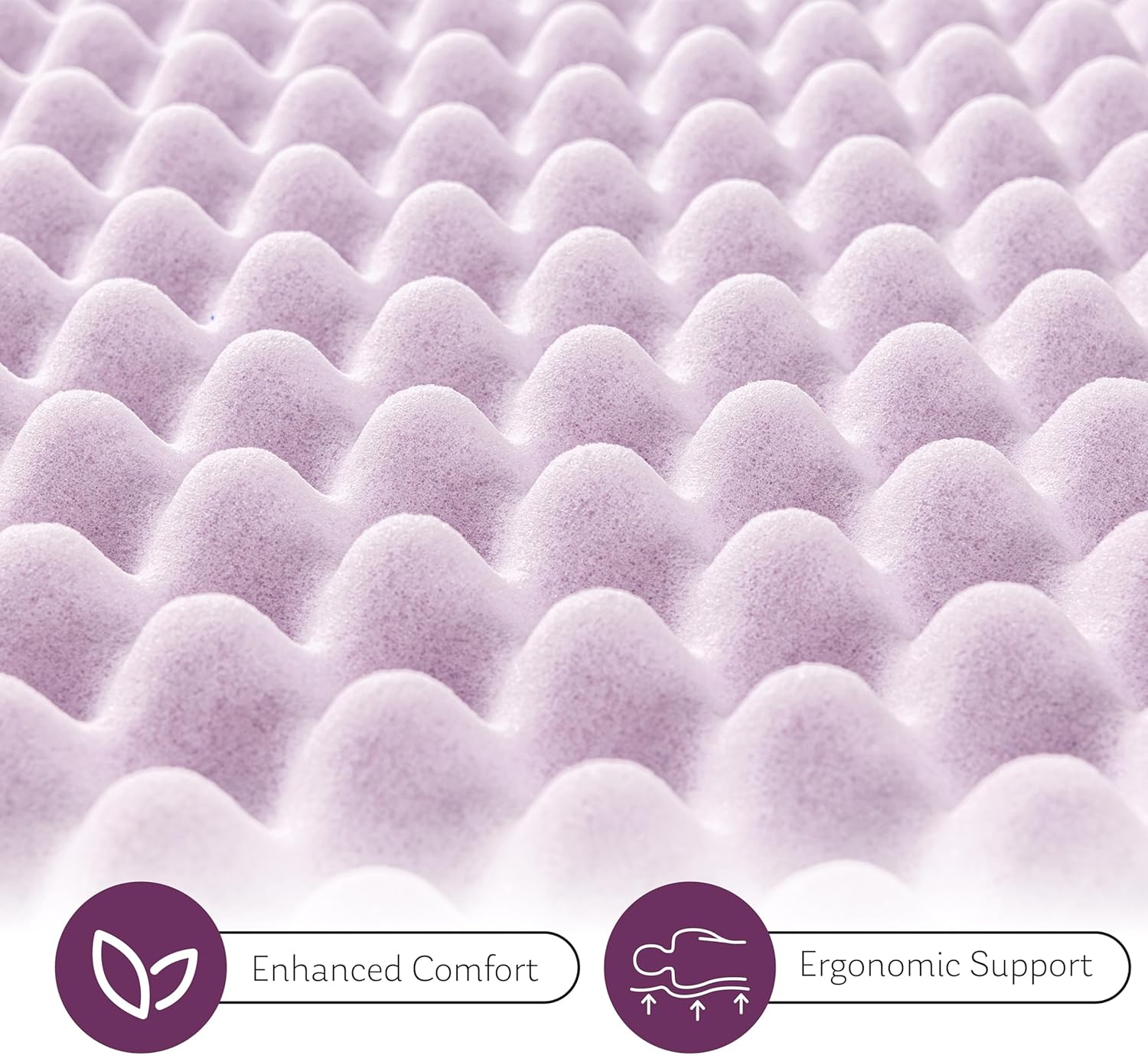 Crafted for superior comfort and support, this 3-inch egg crate queen mattress topper combines luxury with practicality. Featuring a CertiPUR-US certification, it ensures the use of safe, non-toxic materials that contribute to a healthier sleep environment. The gentle lavender scent adds a calming touch, promoting better sleep quality and relaxation throughout the night.