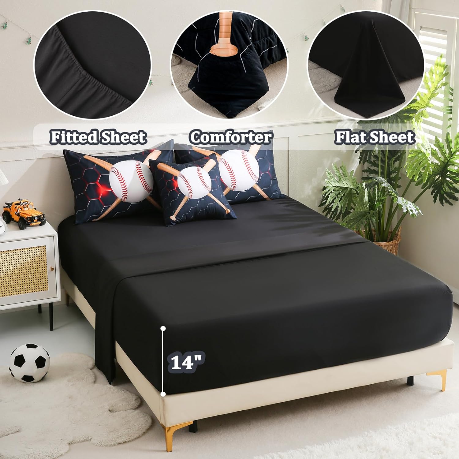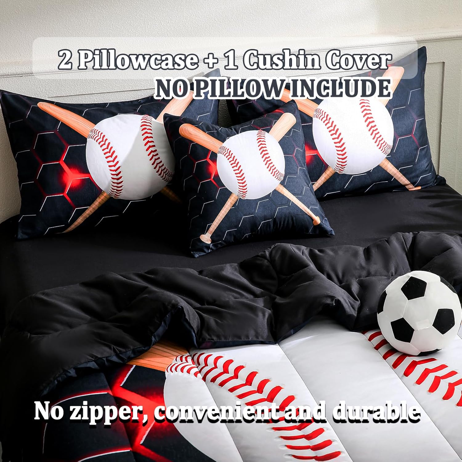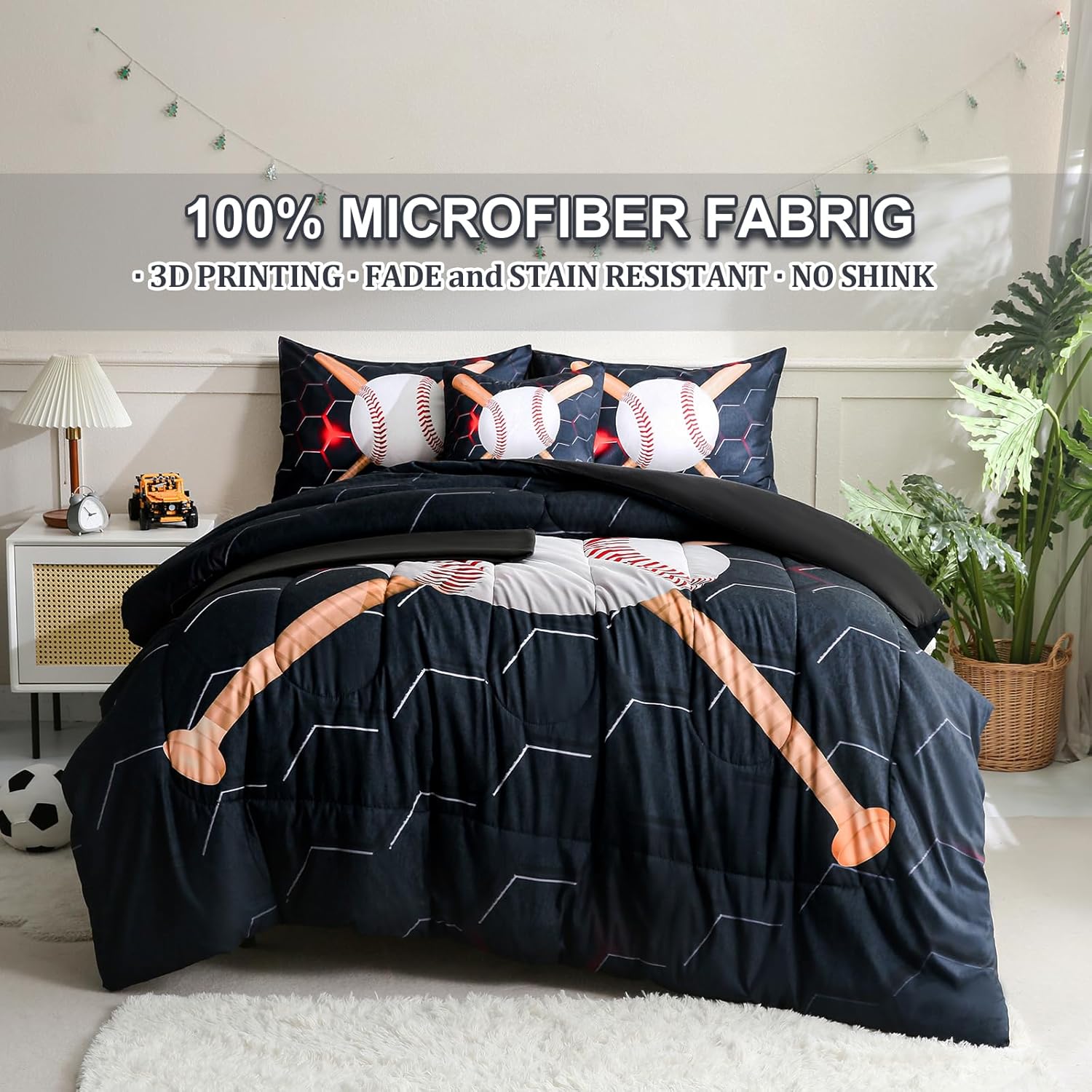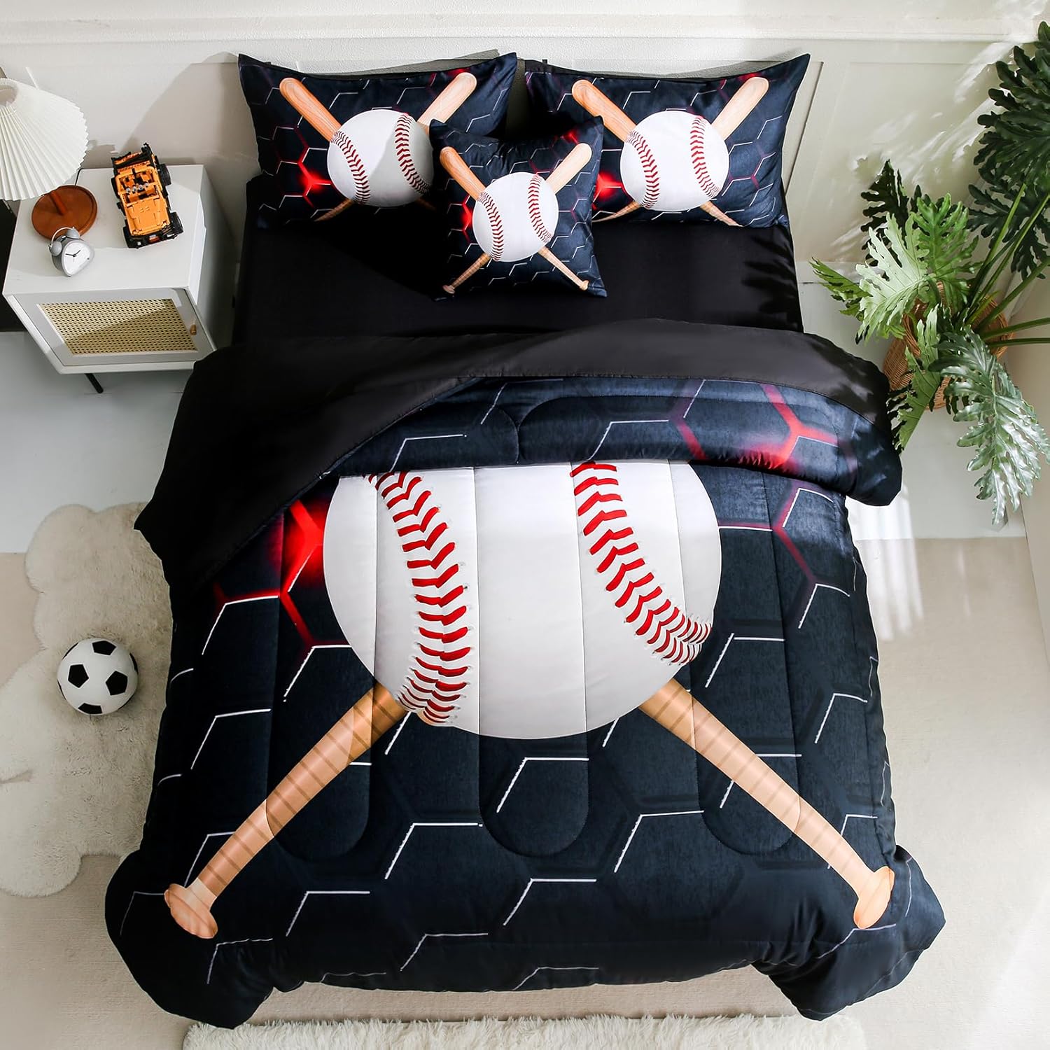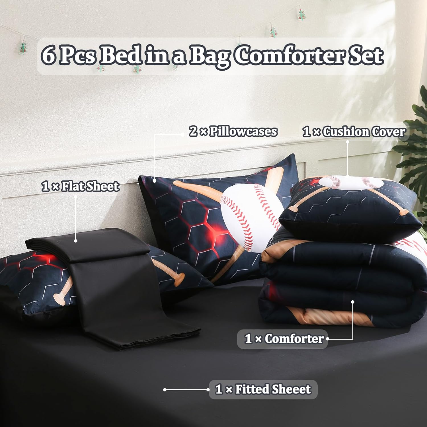 Bring a bold and energetic style to your boyâs room with this 6-piece sports bedding set featuring a vibrant baseball design. Perfect for creating a fun atmosphere that reflects his love for the game, this set is both stylish and comfortable. Constructed from 100% microfiber material, this comforter and bedding set offers a luxuriously soft feel, making it ideal for bedtime. Its fluffiness and warmth add to the cozy environment, while the fabric ensures long-lasting durability and color retention. Each piece of this bed-in-a-bag set is crafted with careful attention to detail. The tight stitching ensures that the fill stays secure, preventing clumping and shifting for a consistently plush and comfortable experience. This set includes a twin comforter, fitted sheet, flat sheet, two pillowcases, and a cushion cover, providing a complete and cohesive look. Whether itâs for a bedroom, dorm, or even a vacation rental, this sports themed bedding set is designed to adapt to any setting. Its lightweight yet medium thickness comforter offers comfort throughout the year, making it suitable for all seasons. Plus, the easy care features like machine wash and tumble dry make it simple to maintain for long-term use. Great for birthdays, holidays, or everyday decor, this set is an excellent way to add a sportsy vibe to a child's space. It combines the functionality of bedding with the excitement of a themed design, offering a unique and eye-catching option for any room.Baseball Themed Kids Bedding Set for Boys