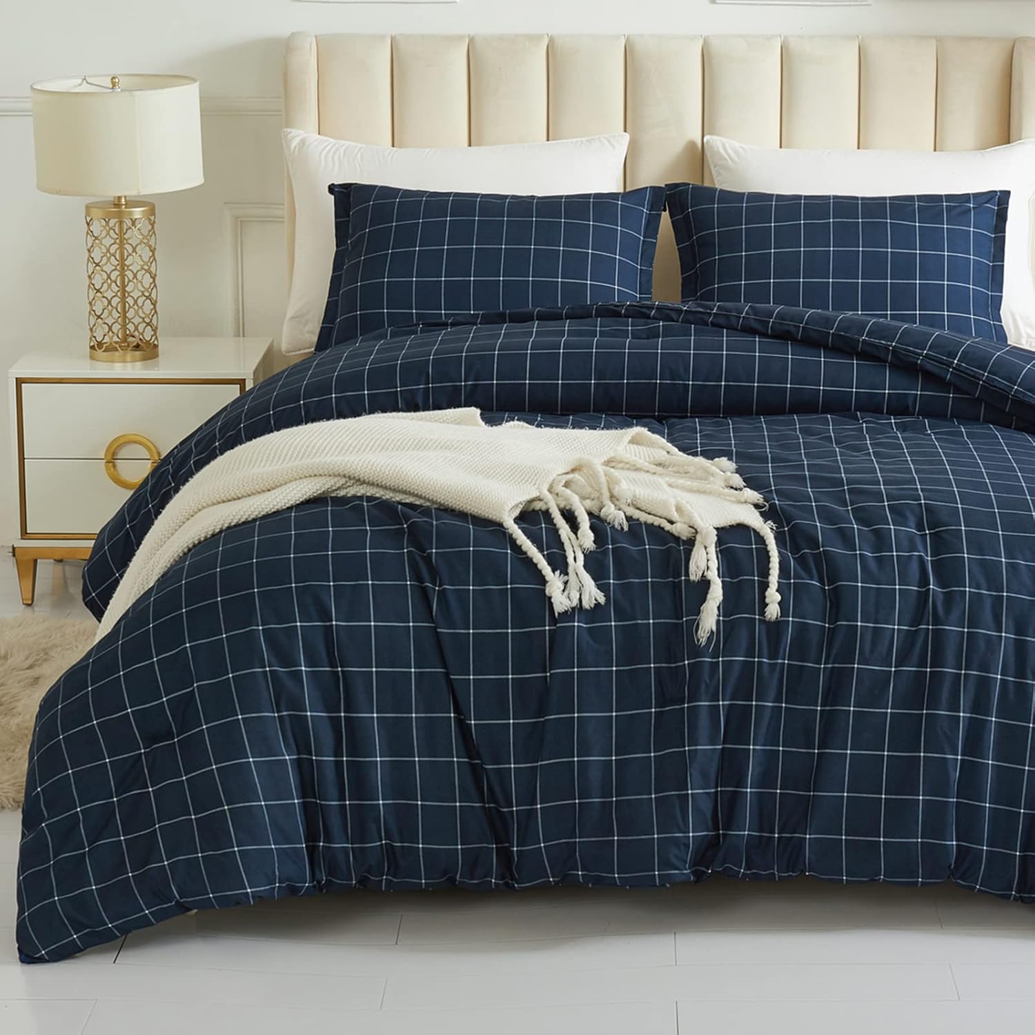 Thanks to its breathable microfiber filling, this comforter set keeps you cool during warmer nights while ensuring a cozy, restful sleep. The minimalist navy grid pattern, paired with clean white lines, adds a sophisticated touch to any modern or traditional decor.