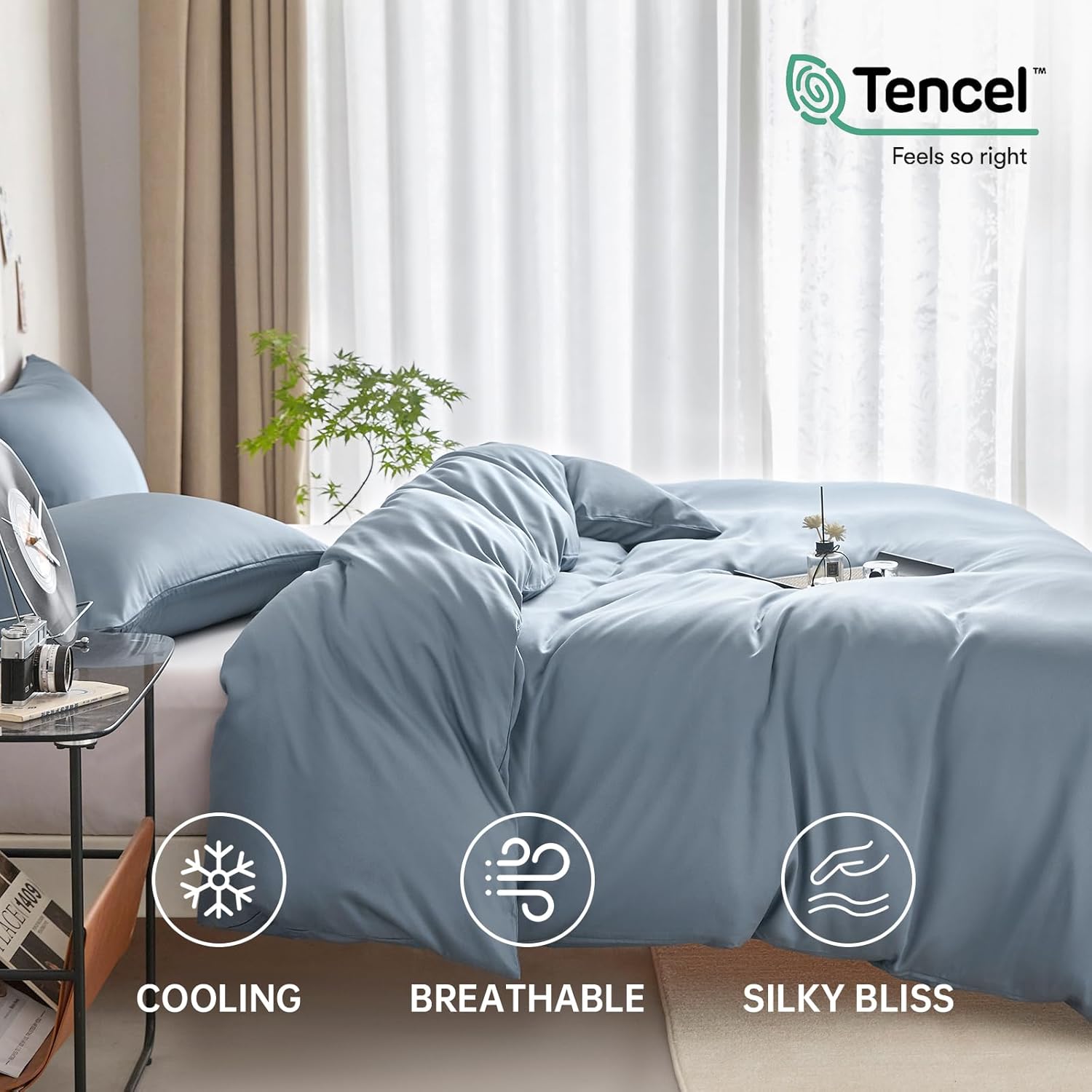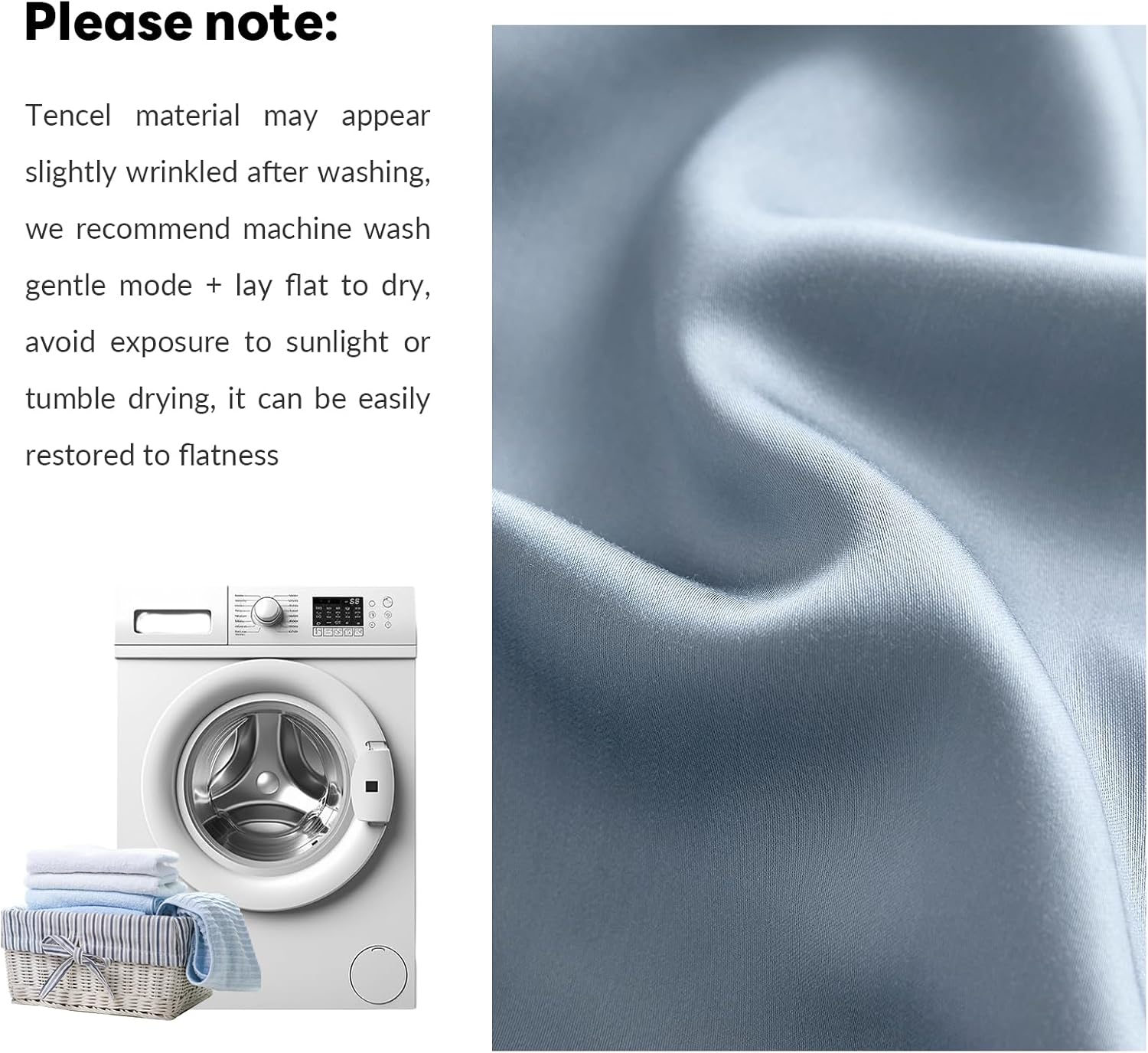 Made from 100% Lenzing Tencel, this duvet cover set offers an unmatched silky-smooth texture thatâs gentle on your skin and perfect for those with allergies or sensitive skin. The fabric provides natural temperature-regulating properties, keeping you cool during hot summer nights and warm in colder weather for a restful and balanced sleep. The 3-piece set includes a duvet cover and two coordinating pillowcases, giving you everything you need to elevate your sleep zone without the inconvenience of regular washing or ironing.