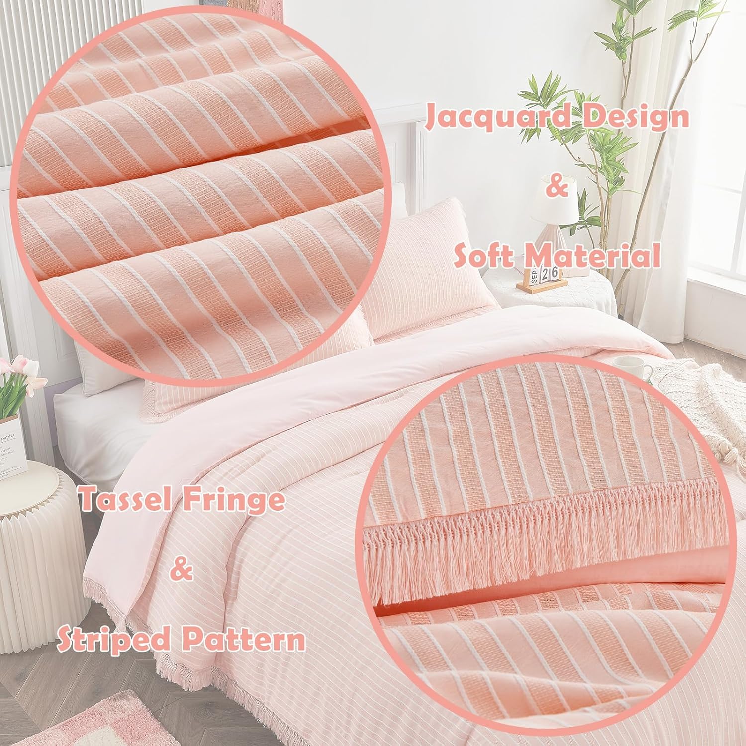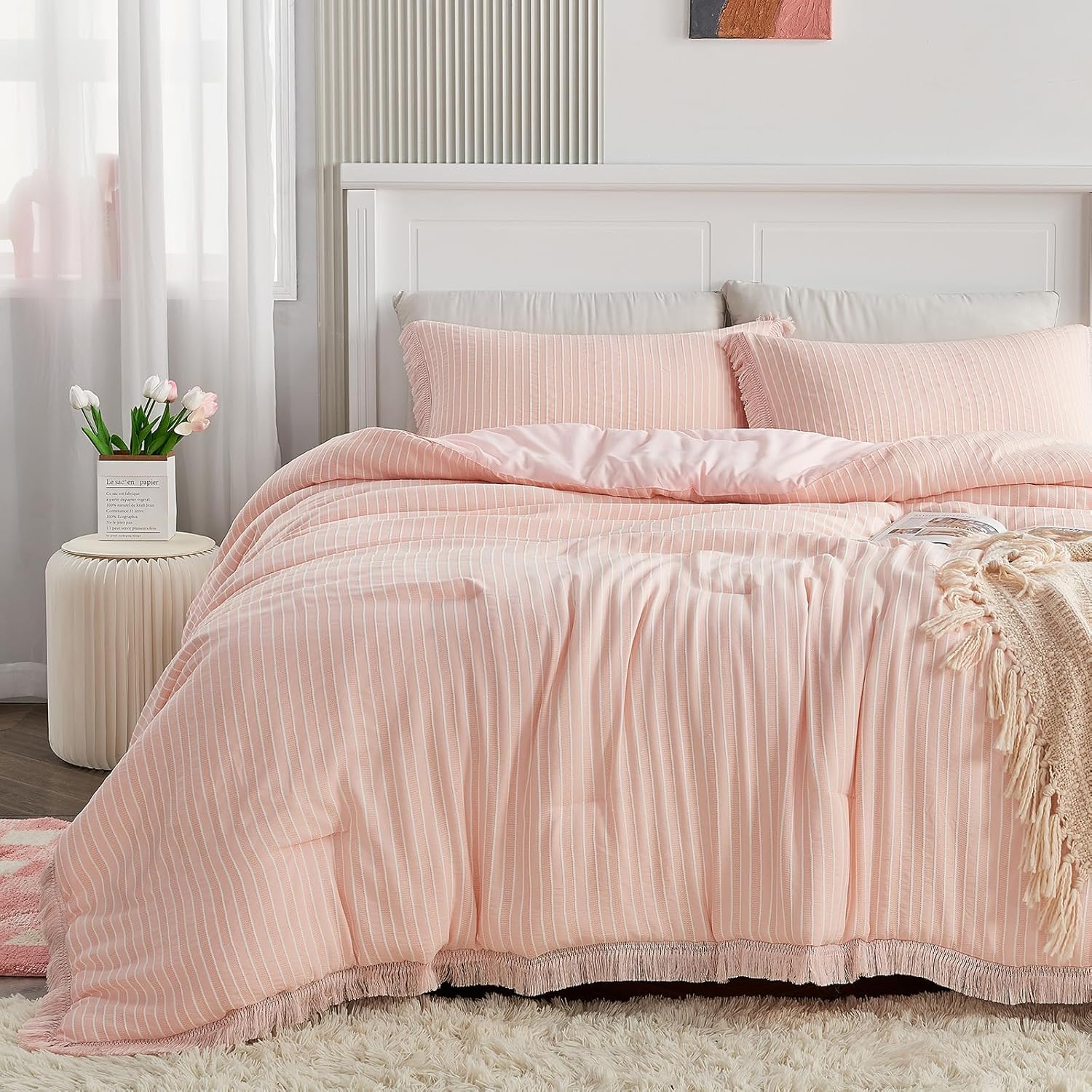 The comforter features playful tassel fringes that add a whimsical flair, while the intricate jacquard stripes deliver a sophisticated and textured look. These details ensure that your childâs bedroom feels both stylish and warm, creating the perfect sleep environment.