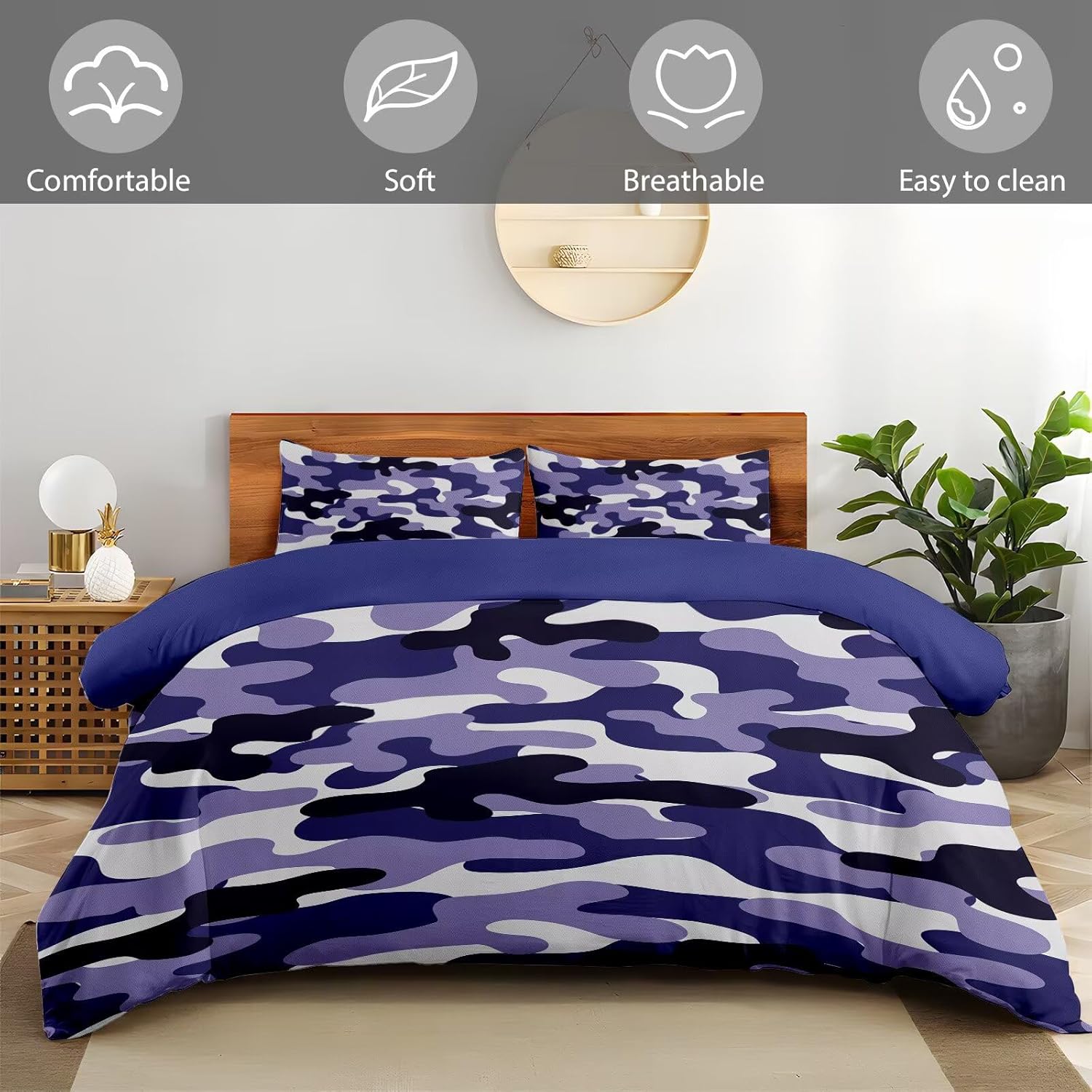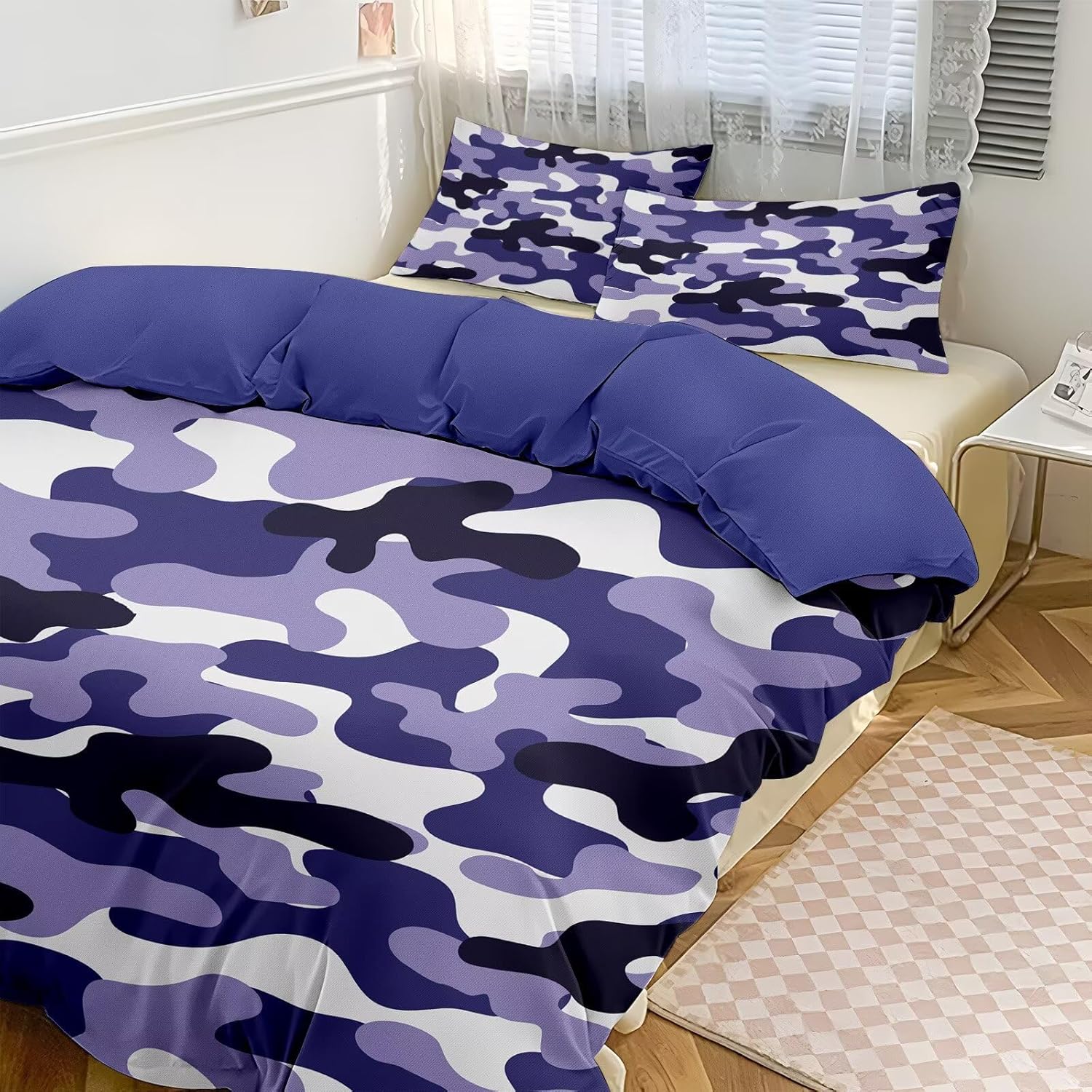 This 3-piece bedding set features a striking blue and white camouflage design, blending modern aesthetics with a rugged charm that makes your space stand out. The soft and cool fabric ensures a comfortable, restful sleep while adding a vibrant touch to your bedroom. Perfect for everyday use, the duvet cover and pillow shams are built for durability and effortless care, with long-lasting color that wonât fade over time.