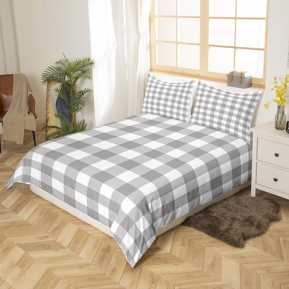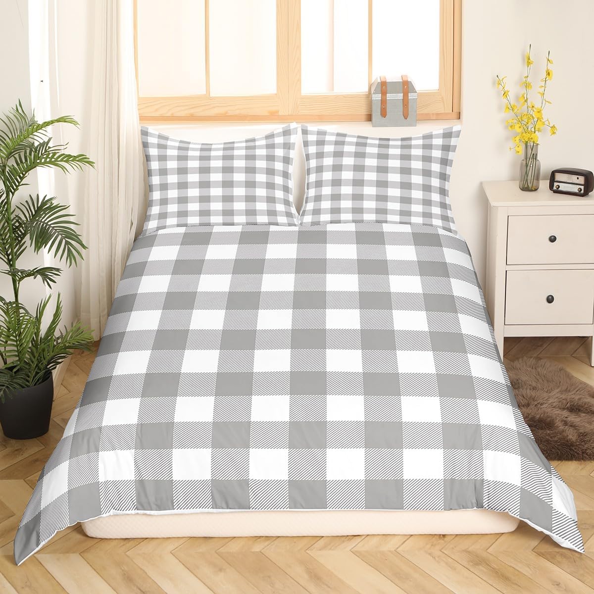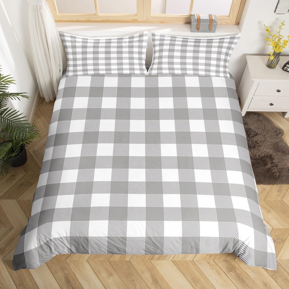 Add a touch of contemporary style to your bedroom with Erosebridal's Grey Plaid Duvet Cover Queen. Its modern geometric gingham pattern is a great choice for boys, teens, and men who appreciate a bold yet sophisticated look. This duvet cover is not only stylish but also functional, offering a soft and breathable surface for comfortable sleep. The 3D printed design ensures vivid colors that stay bright for longer, while the durable construction guarantees long-lasting performance. It's easy to use with a hidden zipper closure and corner ties, and it's built to be simple to cleanâmachine washable and safe for low heat tumble drying.