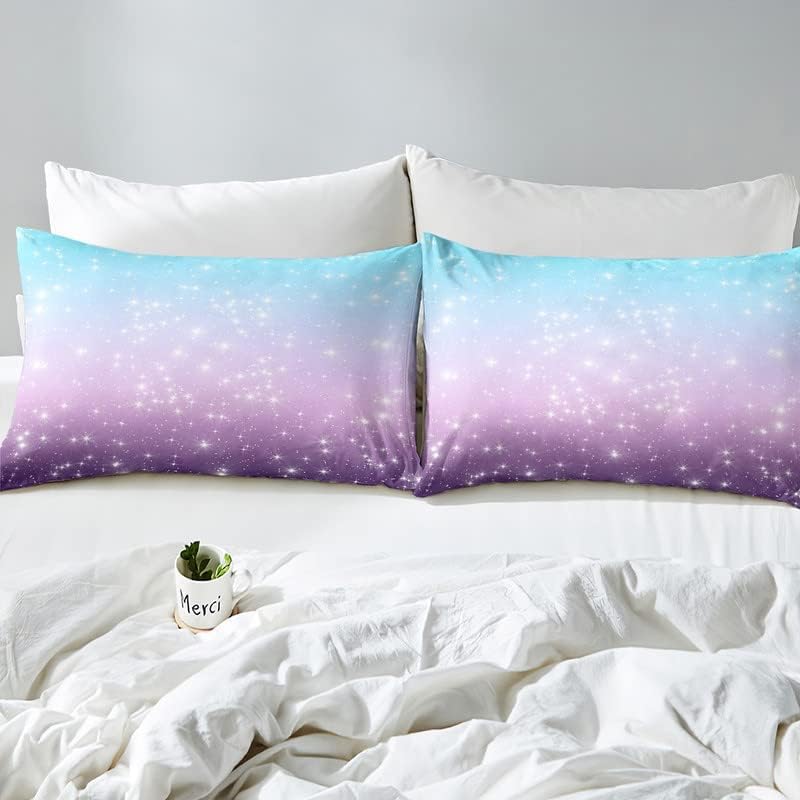 This bedding set is more than just functional â it's a statement piece. The sparkly glitter finish adds an eye-catching glow, while the pastel tones and star pattern create a dreamy, magical atmosphere. It's a perfect fit for girls, boys, teens, or women's bedrooms, and its machine-washable and low-heat tumble dryable features make maintenance a breeze.