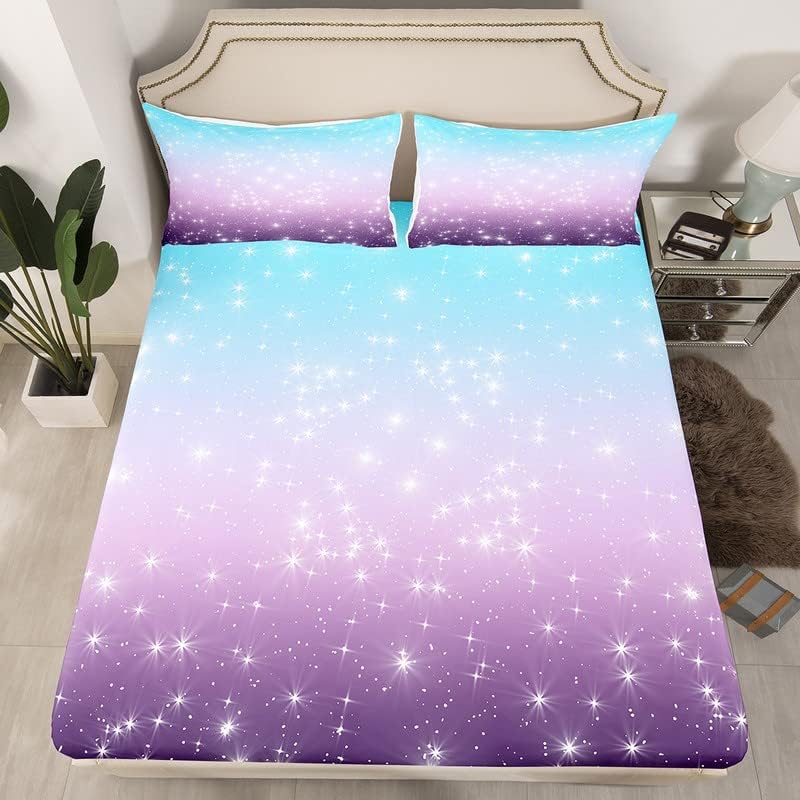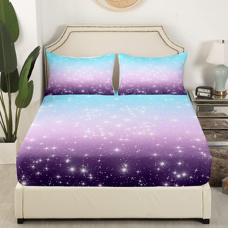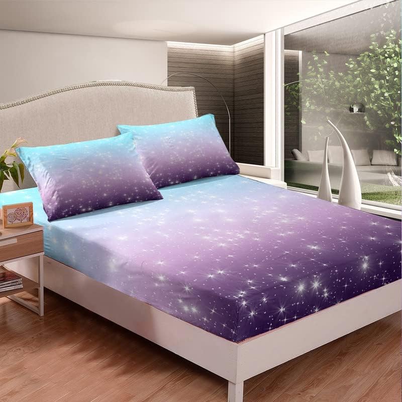 Erosebridal's Kids Space Star Glitter Fitted Sheet Set brings a touch of cosmic magic to any child's room or young adult space. Designed with a beautiful ombre gradient of blue and purple, it features a starry sky pattern that captures the imagination and adds a whimsical charm to your bedding setup.