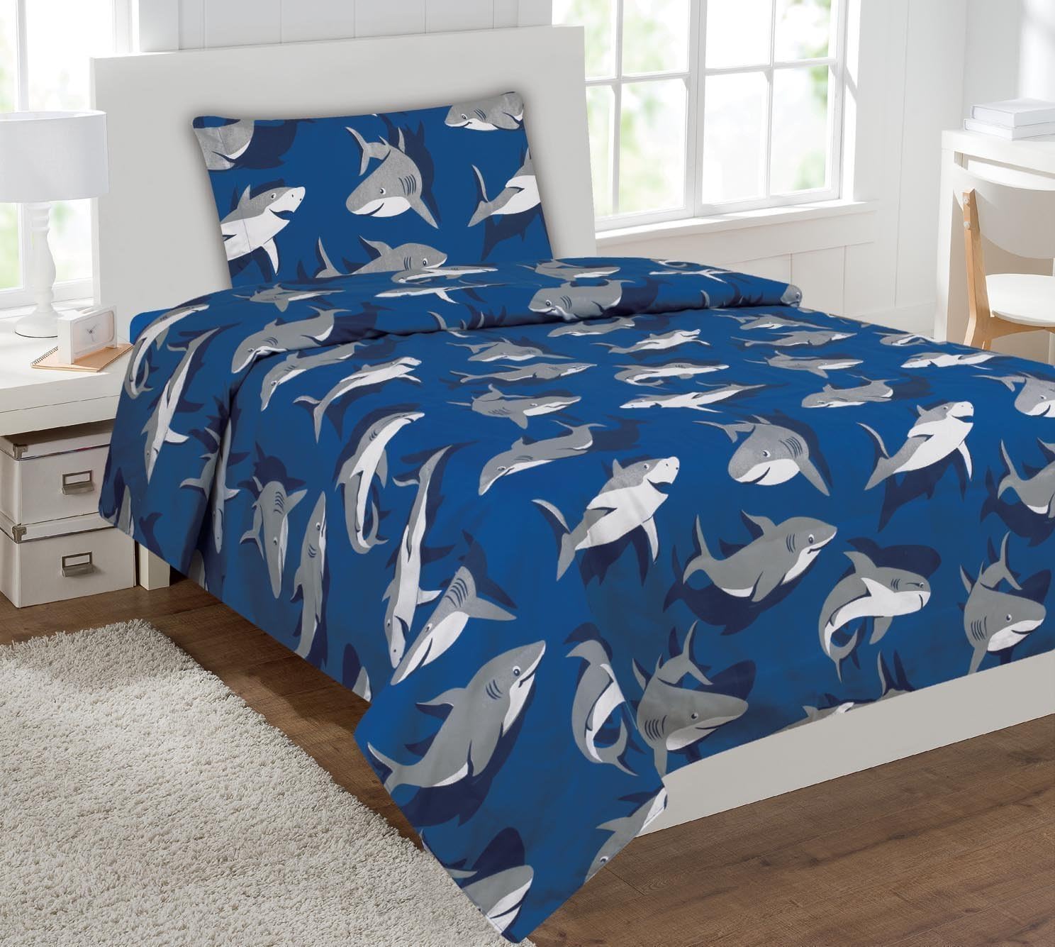 Bring the excitement of the ocean to your child's room with this adorable twin sheet set. Featuring a playful shark design, it adds a fun and adventurous touch to any bedroom decor, making it the perfect choice for kids who love the sea.