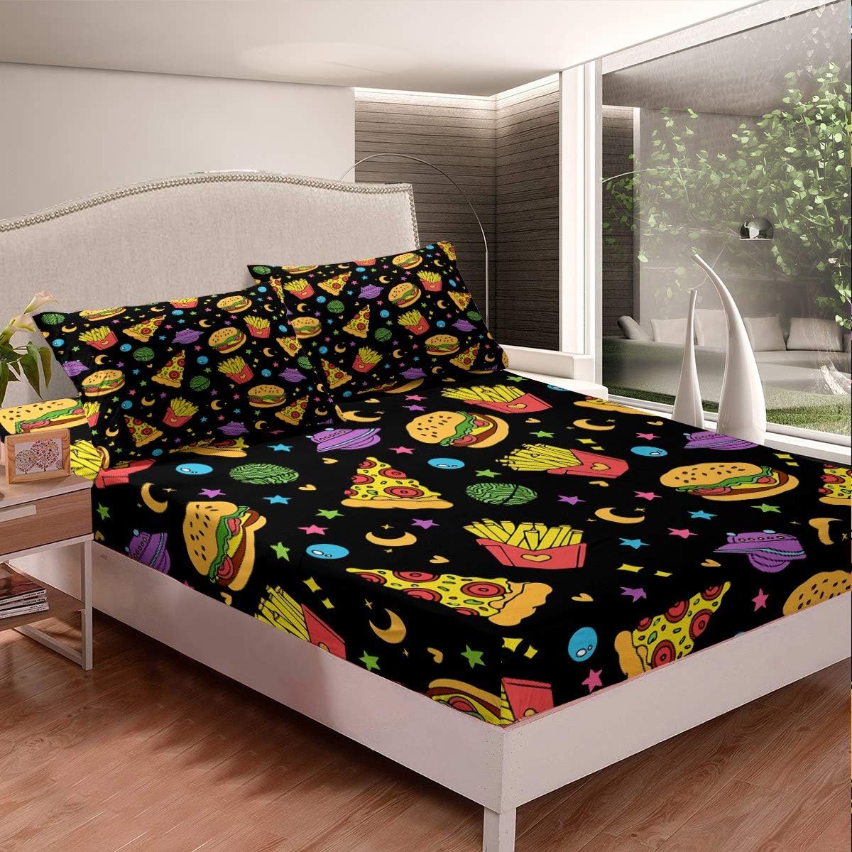Add a touch of fun to your child's sleeping space with this vibrant and playful Feelyou bedding set. Inspired by the beloved Fast Food theme, it features adorable 3D printed designs of hamburgers, pizza, and French fries that bring a lively and whimsical feel to any room.