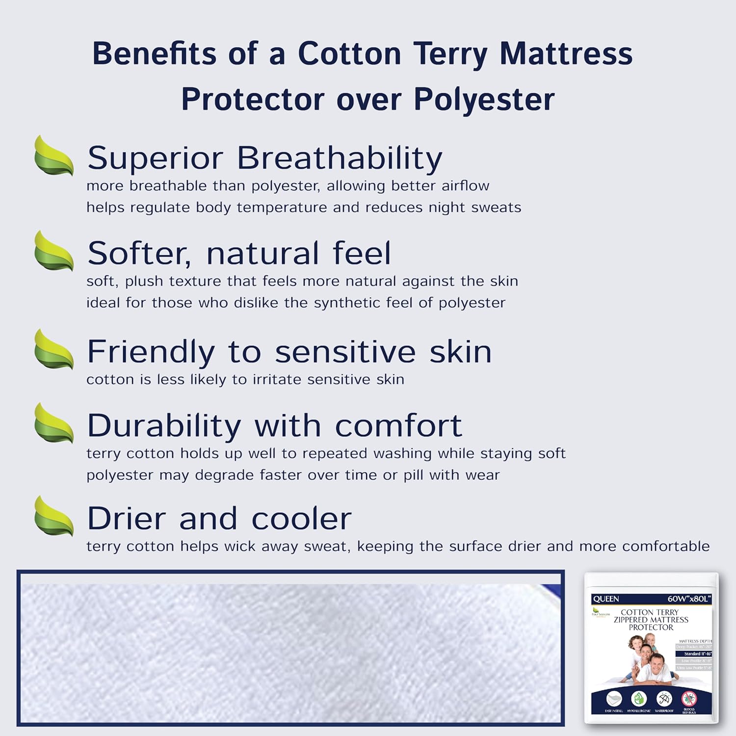 With a soft cotton terry top, it delivers a comfortable, noiseless sleep surface that outperforms traditional covers. Itâs also waterproof, preventing leaks and keeping your mattress clean and dry for longer. The hypoallergenic material is perfect for creating a healthier sleep environment, trapping dust mites and pet hair effectively to maintain hygiene and comfort.