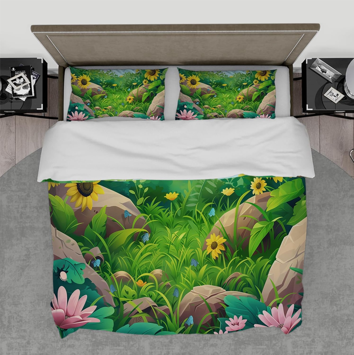 This set features a colorful floral pattern with green grass, yellow sunflower, and pink daisy motifs that bring a whimsical, cheerful vibe to any bedroom. The design is not only eye-catching but also versatile, suitable for modern or themed spaces.