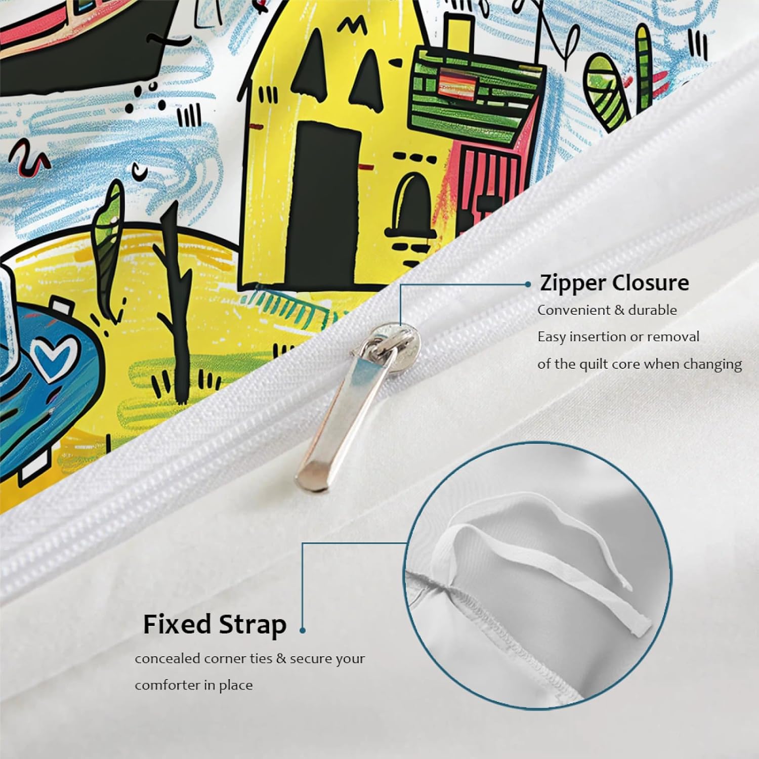 Its hidden zipper design makes it easy to open and close while keeping the cover securely in place. The 4 corner ties prevent shifting and add stability, ensuring that your childâs favorite quilt maintains its shape and comfort throughout the night.