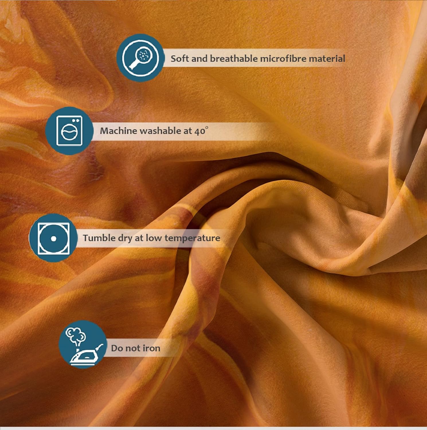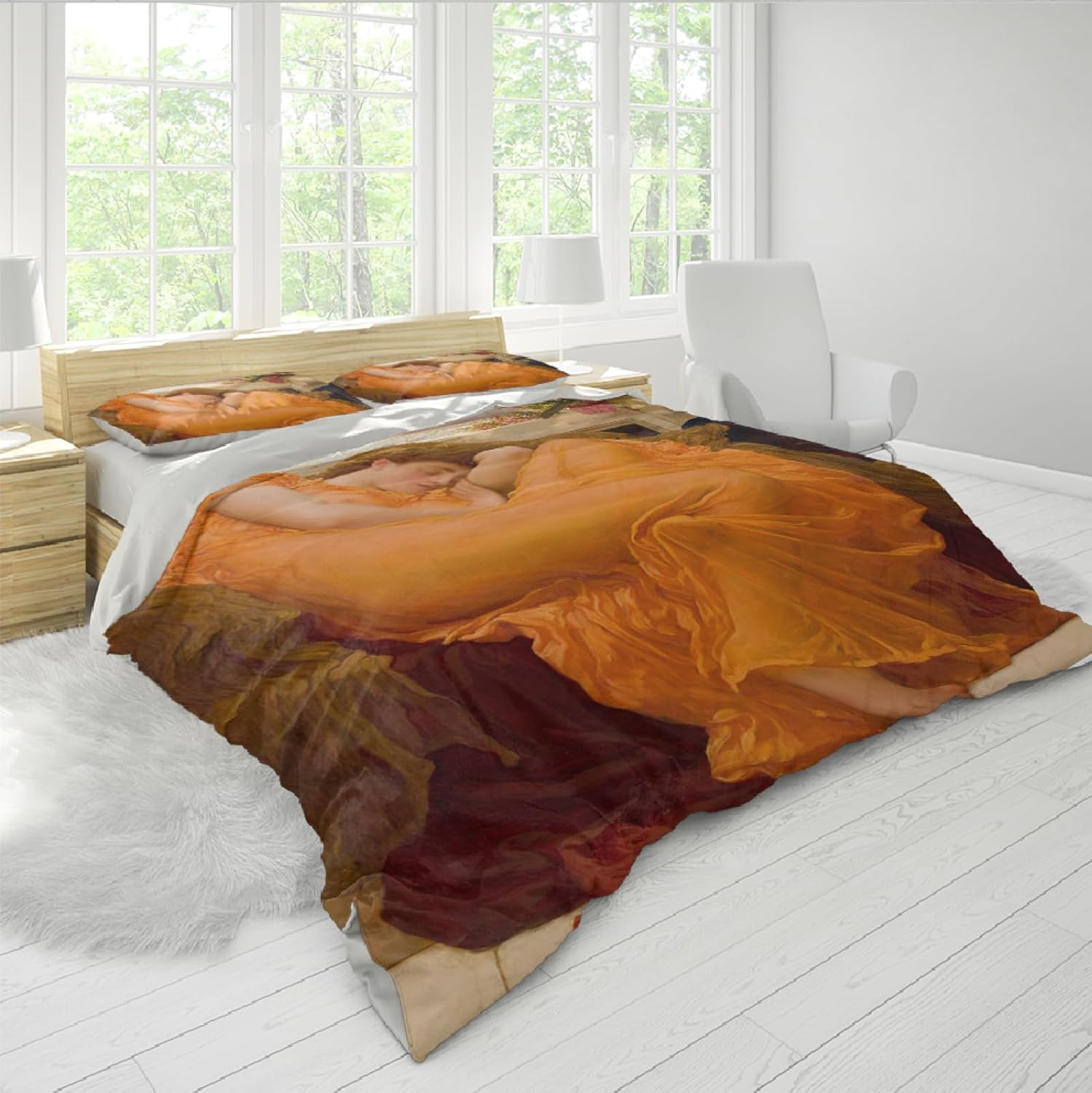 This HOBBOY Orange 3pc Duvet Cover Set brings a modern, elegant touch to your space with inspiration from 'The Flaming June' by Frederic Leighton. Its luxurious microfiber material offers a soft and comfortable feel, perfect for a restful night's sleep. The hidden zipper ensures a secure and effortless fit, while the 4 corner ties keep your duvet in place, preventing any shifting or bunching during the night. Designed for all seasons, the breathable and lightweight fabric maintains comfort year-round, offering a balance of warm and cool sensations. This bedding set is ideal for both kids and adults, combining style with the cozy functionality you deserve.