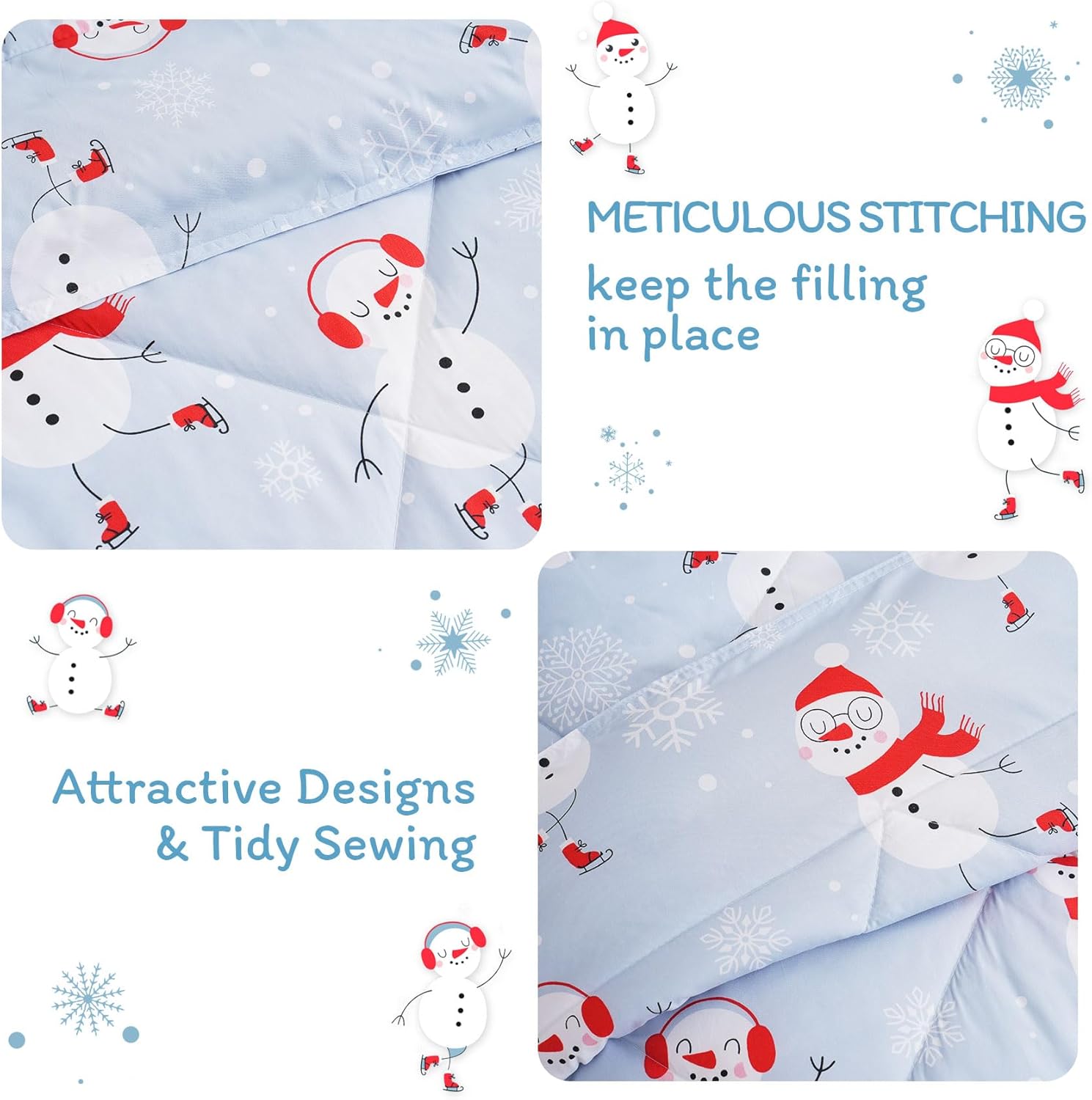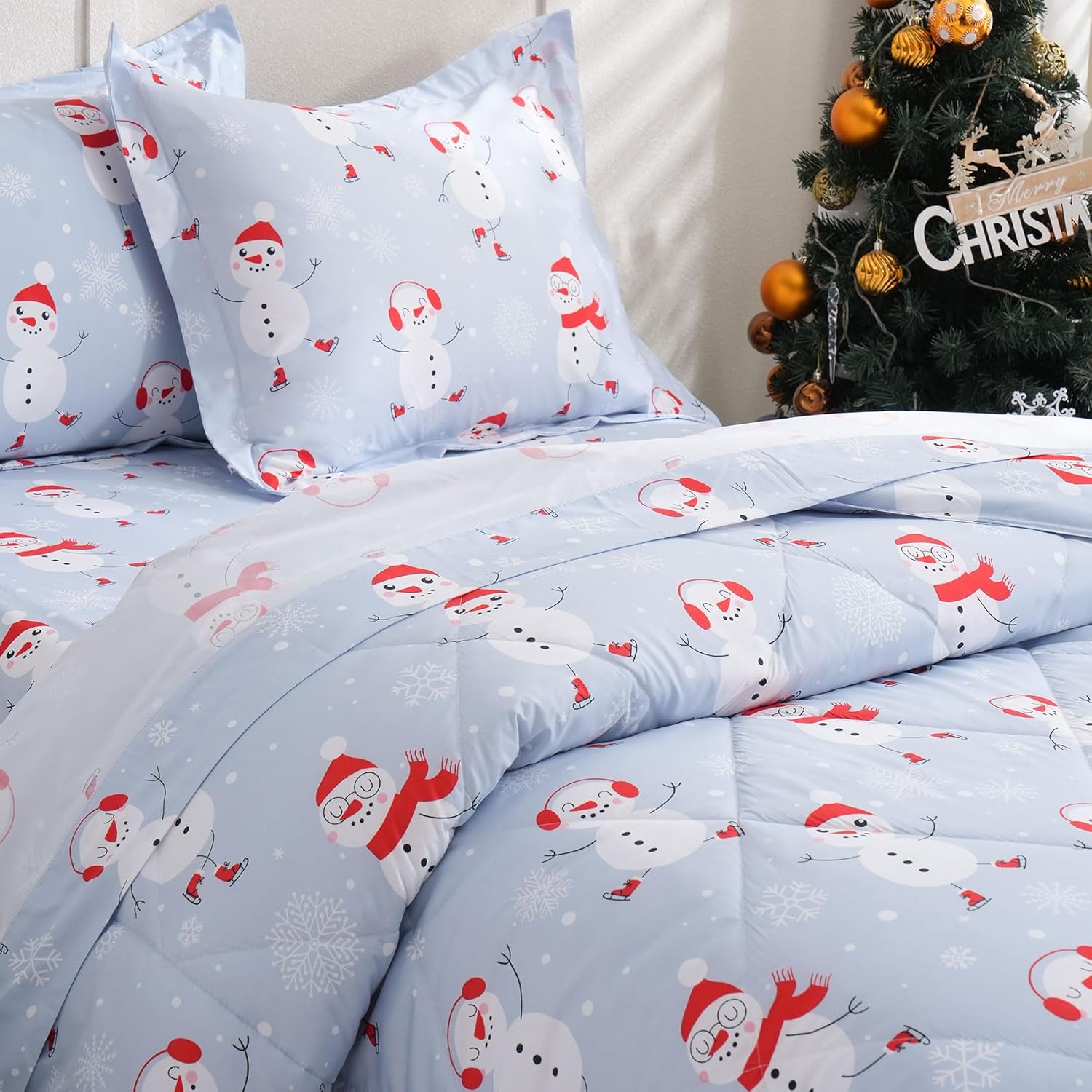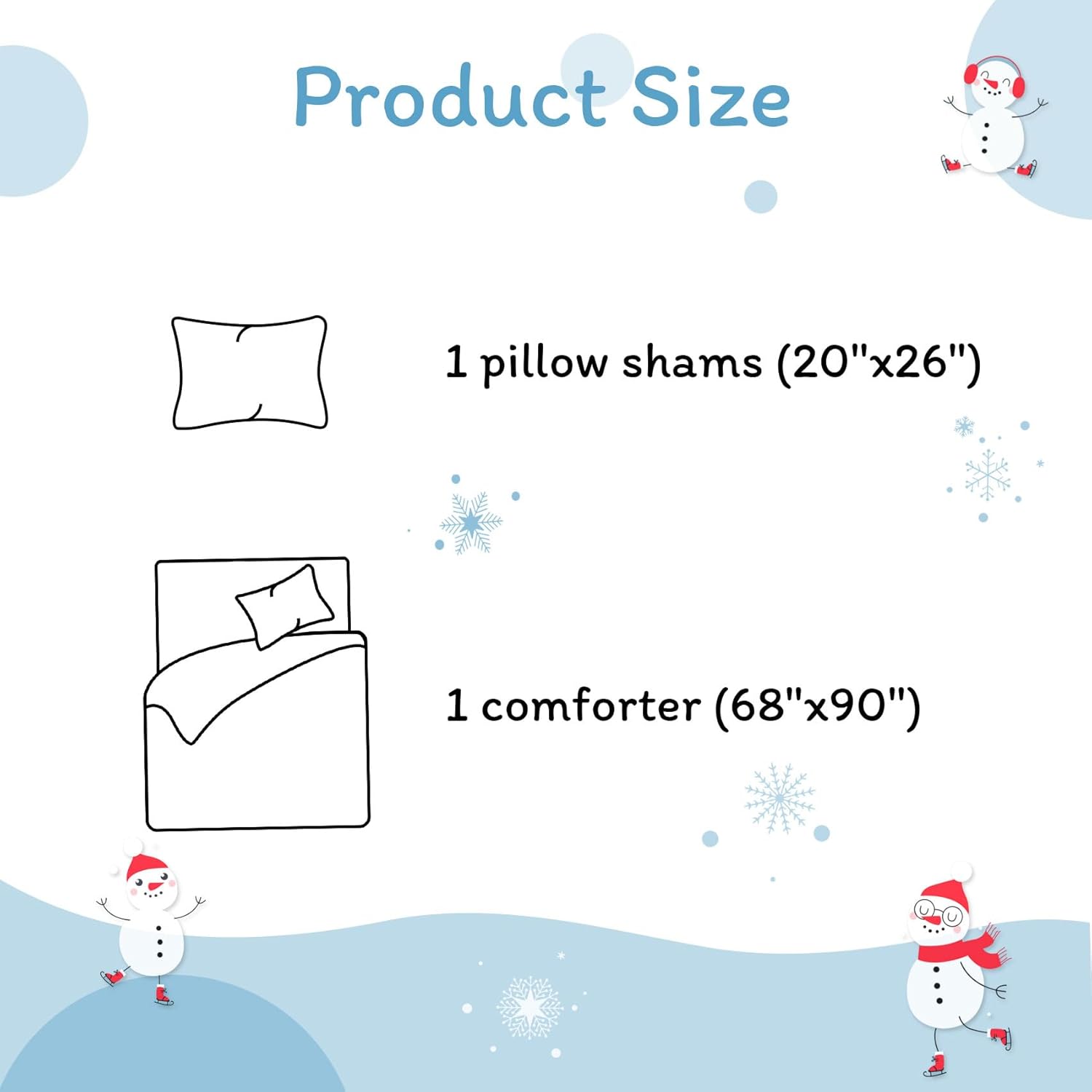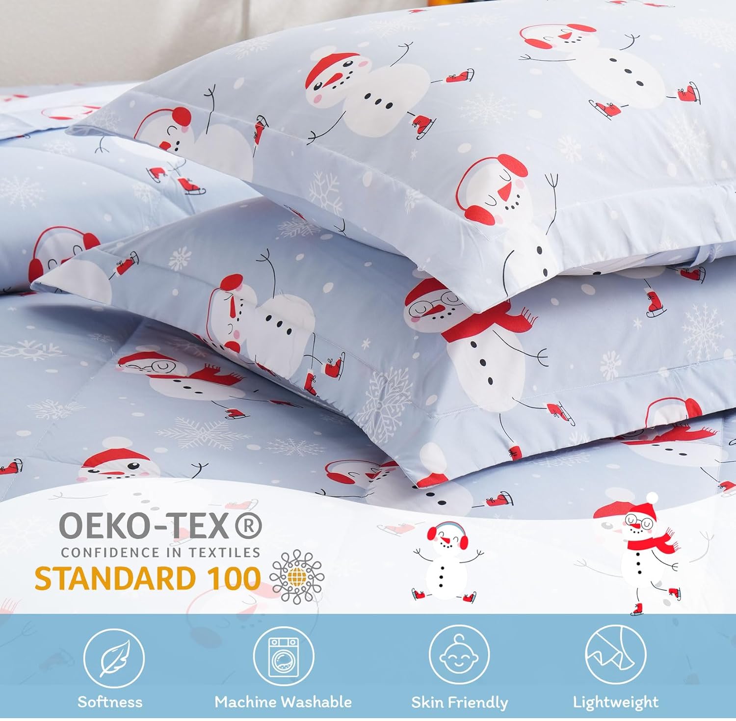Bring a touch of winter magic to your child's room with this charming snowman-themed kids comforter set. Designed for cozy nights and festive fun, it combines softness and durability in every detail. Each set includes a soft, blue comforter and a matching pillow sham, both adorned with delightful snowman illustrations and festive elements like red headphones, scarves, and snowflakes. The premium brushed microfiber fabric gives it a luxuriously fluffy feel, making it ideal for a restful sleep during the holiday season. The lightweight yet insulating fill ensures your child stays warm without feeling weighed down. And with its machine-washable and tumble-dry features, maintenance is a breezeâno fading or pilling worries. This bedding set is a perfect complement to other kids' bedroom essentials like matching sheets and duvet covers, creating a cohesive and whimsical look. Introducing a holiday bedding set thatâs as practical as it is adorable. Whether you're looking to add a cozy cover to your childâs bed or create a festive display in their room, this product offers the perfect balance of comfort and style. Made with durable, easy-care materials, itâs designed to last through the winter months while keeping your little one warm and snug. This kids comforter set is a must-have for any family looking to make their childâs bedroom feel like a magical winter wonderland.Festive Twin Size Kids Comforter Set