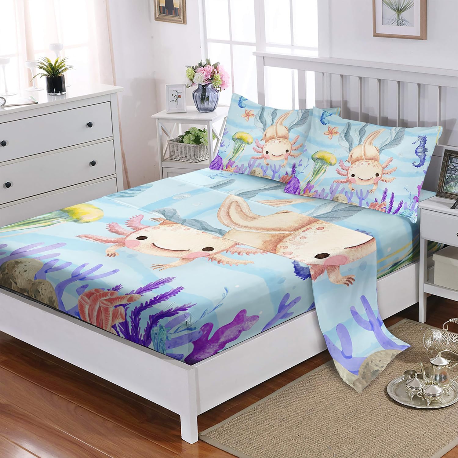 This Kawaii Axolotl Ocean Animal Sheet Set 4Pcs is designed to capture the magic of the underwater world. With detailed, colorful illustrations of axolotls, seahorses, jellyfish, and starfish, it creates a playful and calming atmosphere for bedtime. The 3D-printed designs add depth and texture, making every piece a standout in the room.