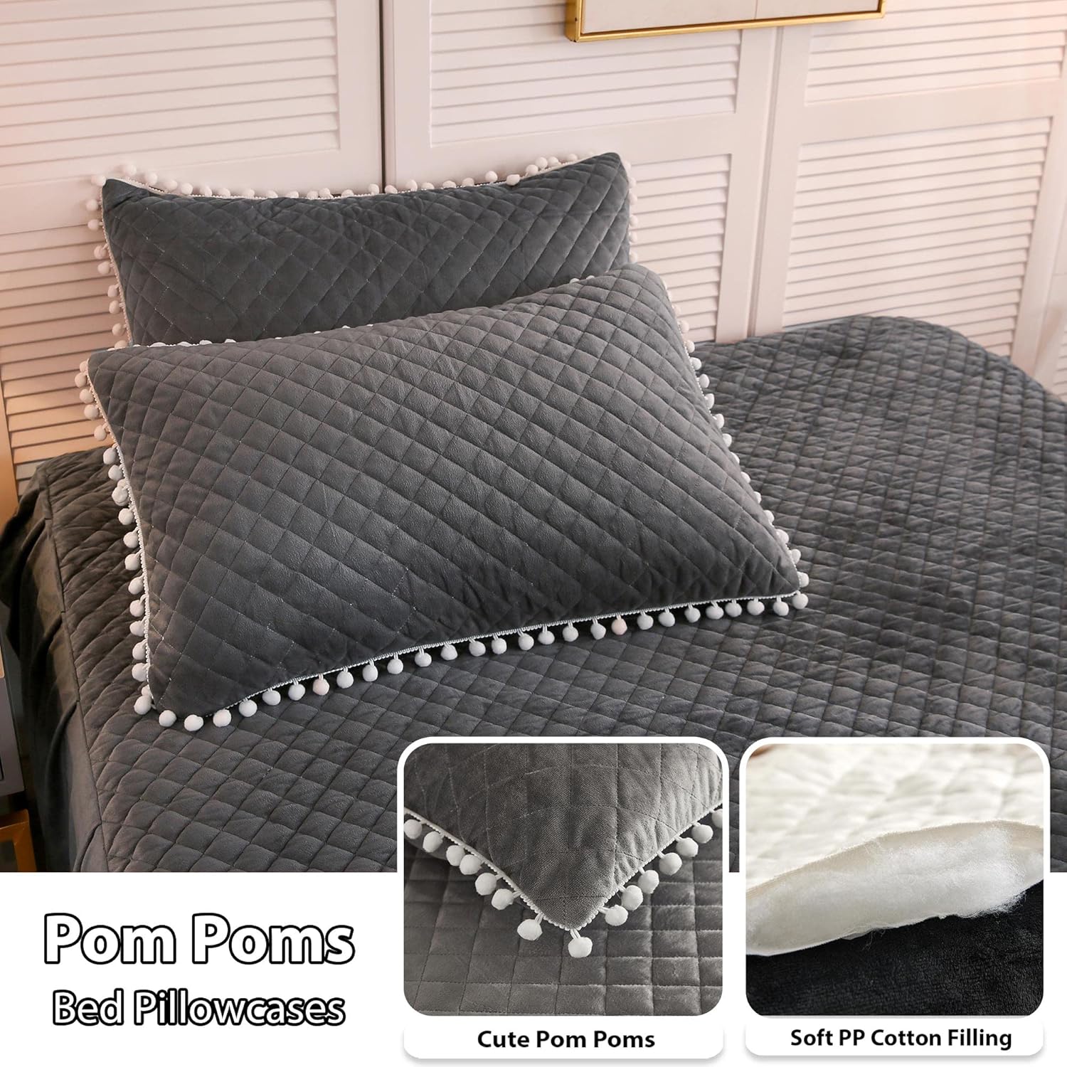 The hidden zipper closure allows for easy access when it's time to remove or wash your duvet cover. Paired with 8 durable corner ties, this design ensures your duvet insert stays in place all night long. The matching white pom-pom trim pillowcases in classic dark gray colors add a charming, whimsical touch to your bedroom setup, offering both fashion and function.