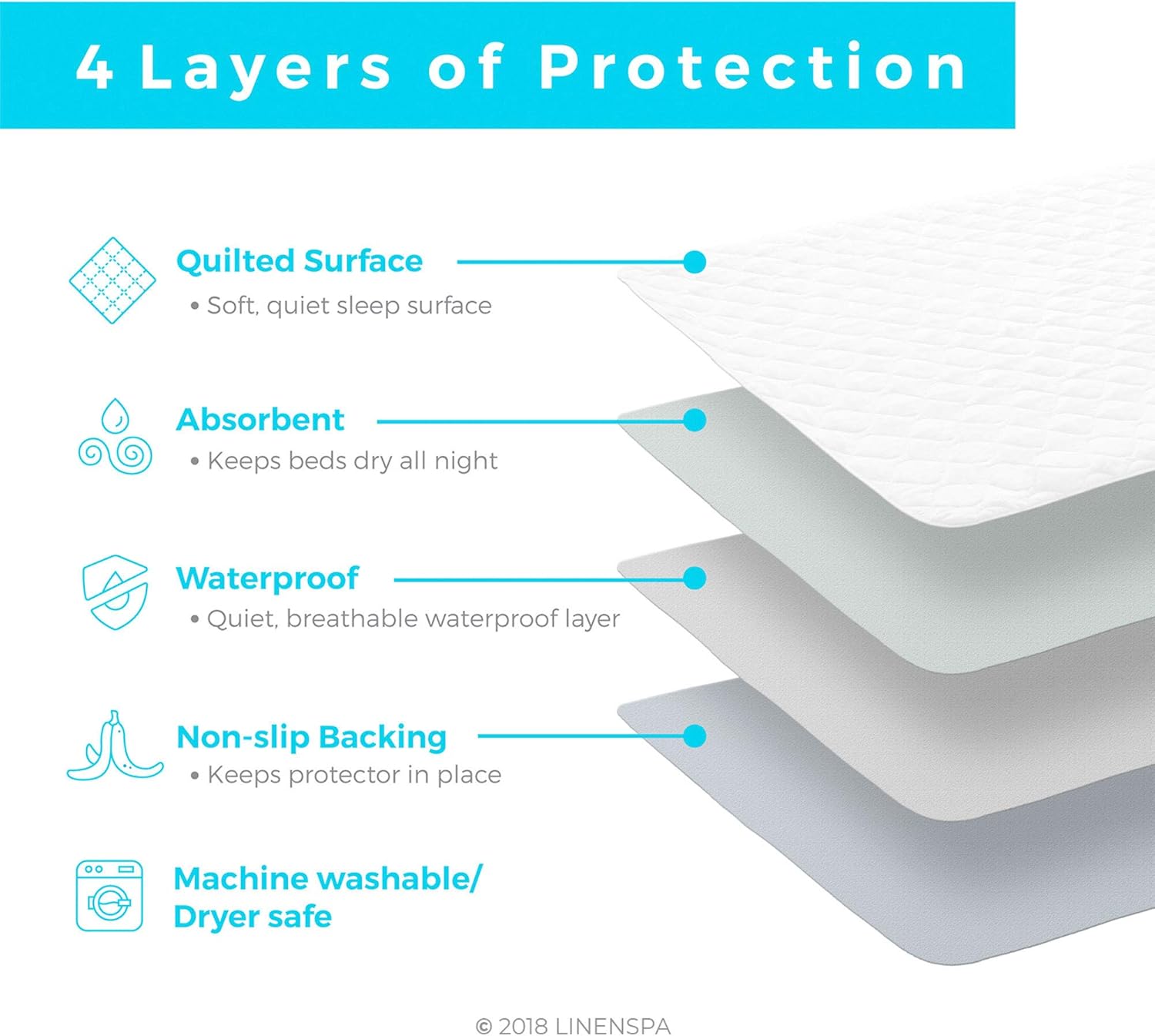 Crafted with a quilted cotton blend, the LINENSPA pad offers a plush and gentle feel underfoot. It's perfect for use with children or adults, ensuring a cozy sleep experience without the worry of leaks.