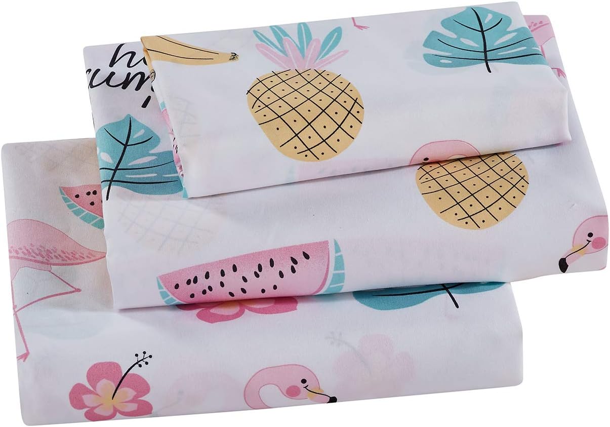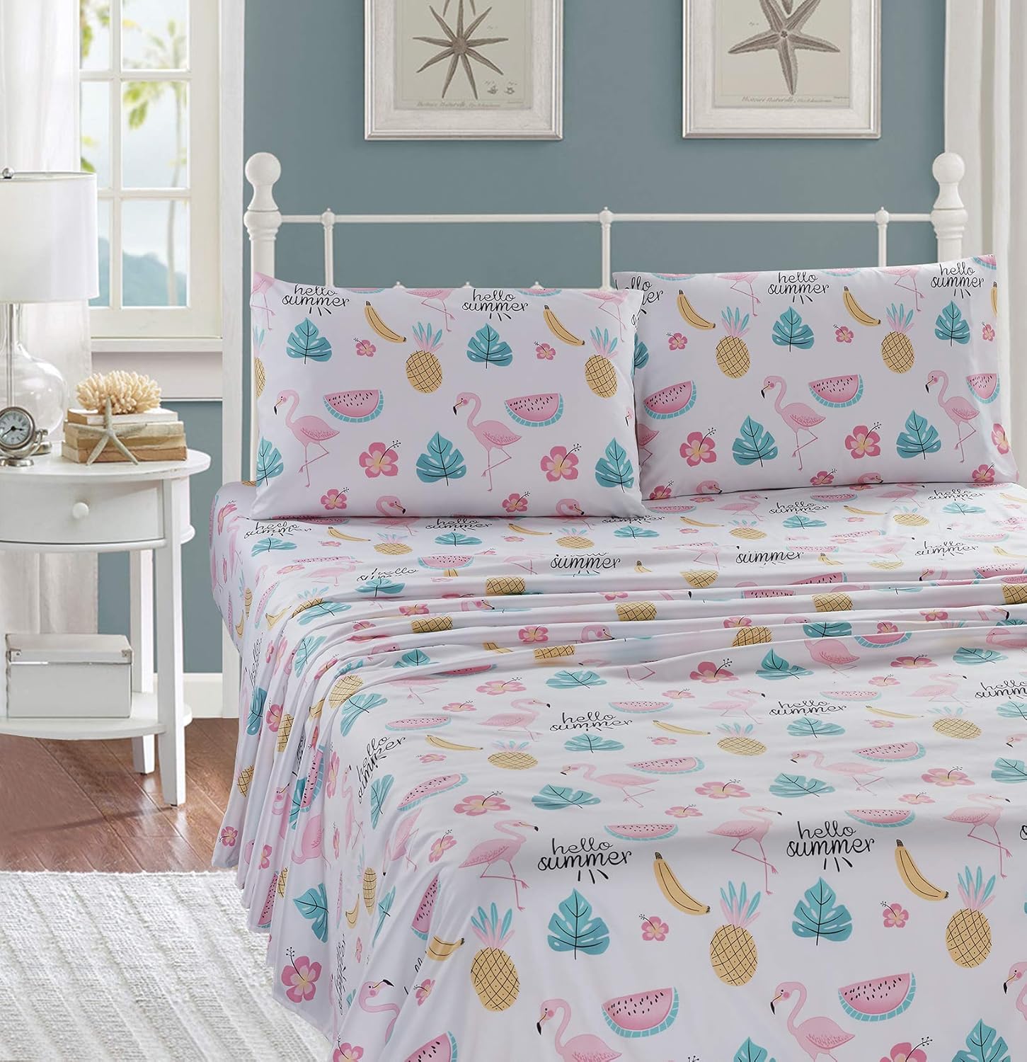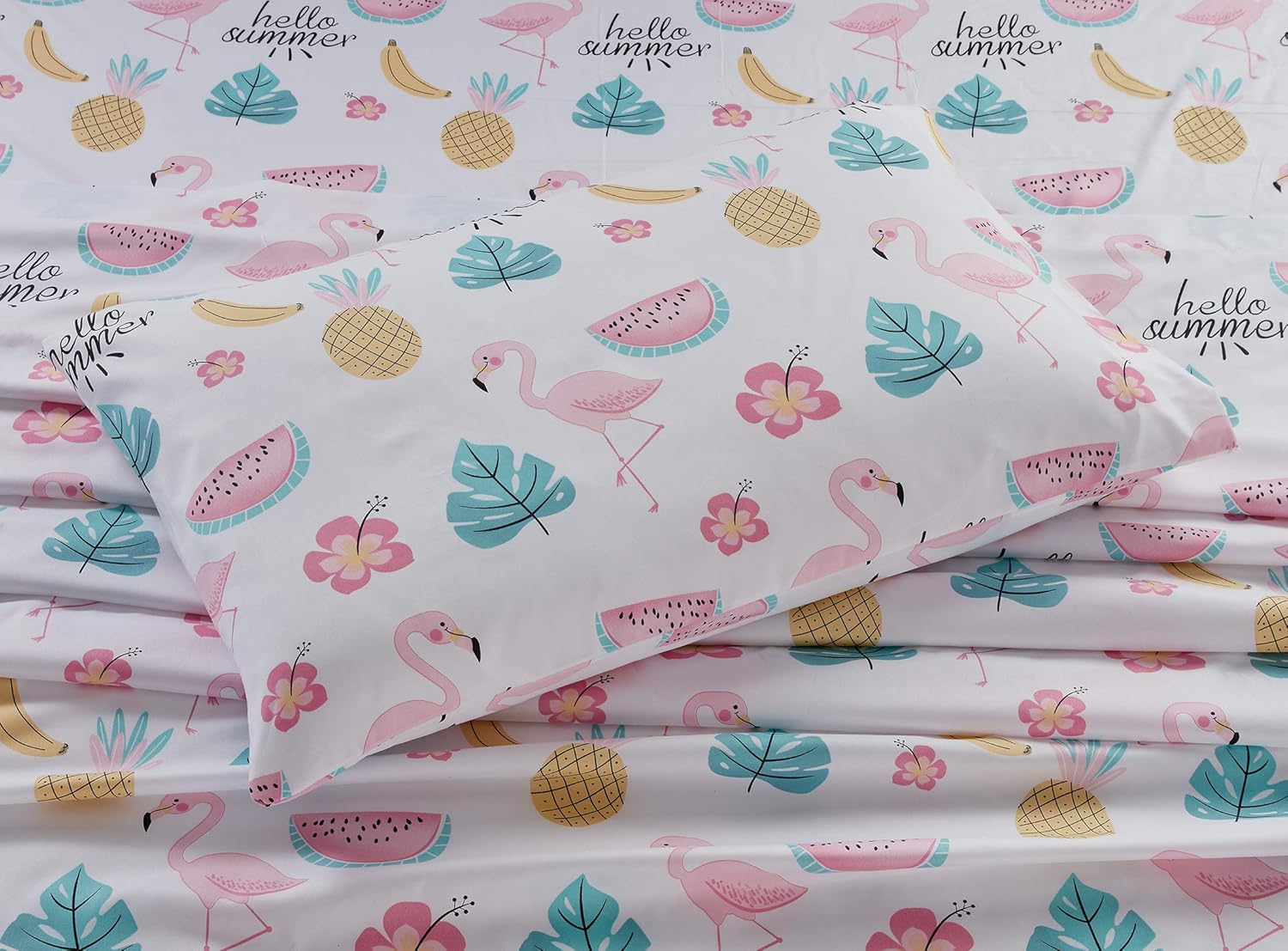 Bring a cheerful and playful vibe to your childâs bedroom with this Linen Plus Full Sheet Set. Inspired by the warmth of summer, the tropical floral pattern featuring flamingo, pineapple, banana, watermelon, hibiscus, and tropical leaf motifs adds a fun and stylish touch to any room decor. This set is designed to make bedtime more enjoyable and cozy for kids and teens alike. The set includes one 80" x 96" flat sheet, one 54" x 75" fitted sheet, and two matching 20" x 30" pillowcases. All pieces are made from 100% microfiber, ensuring a silky-smooth feel that keeps your little one comfortable throughout the night. Easy to care for, it can be machine washed cold and tumble dried low, making it a practical and durable choice for everyday use. Whether you're looking for a fresh start or an upgrade to existing bedding, this vibrant colored bedding set is ideal for creating a welcoming and inviting sleeping environment. The combination of comfort and style makes it a perfect addition to any kids or teens room.Kids Bedding Sheet Set with Vibrant Summer Designs