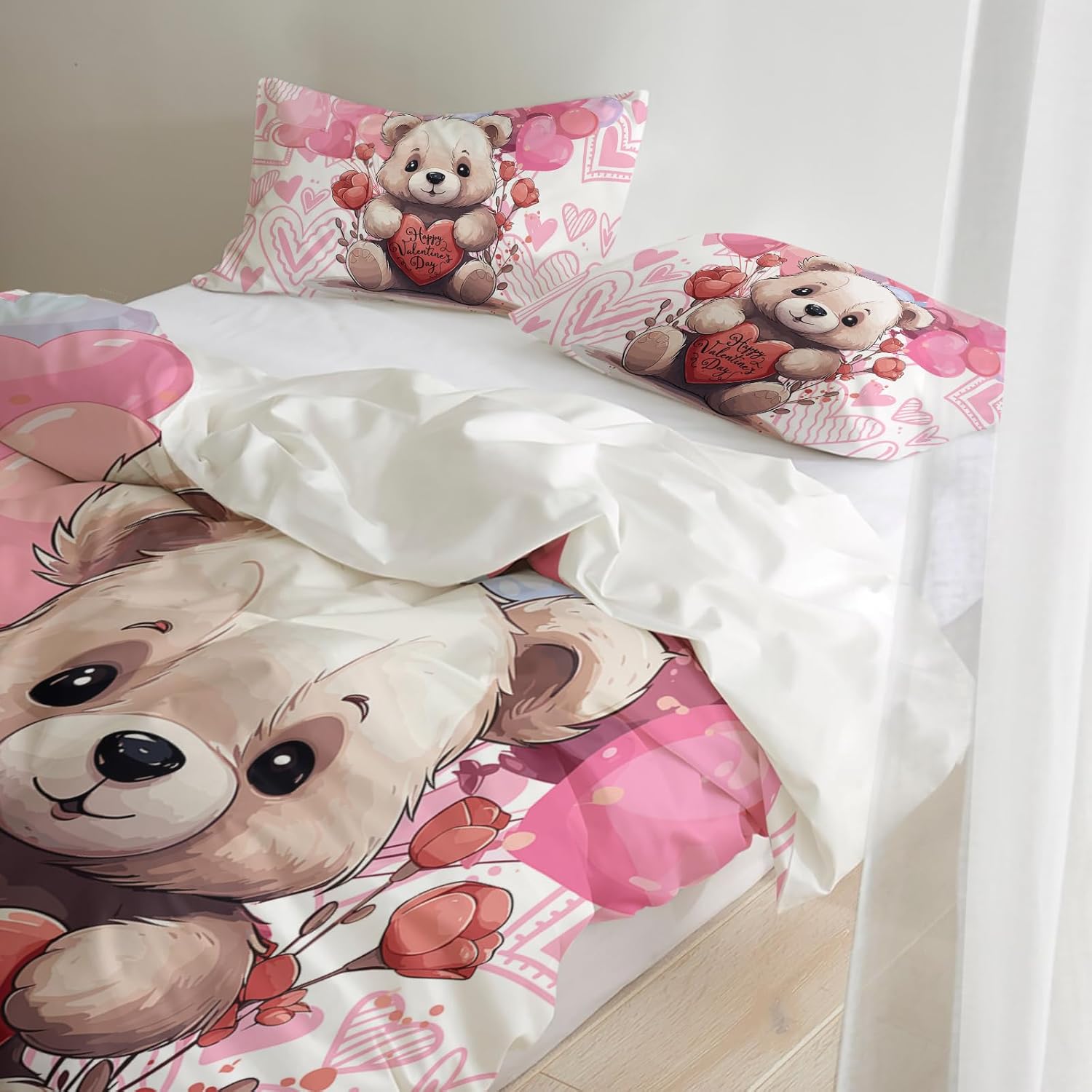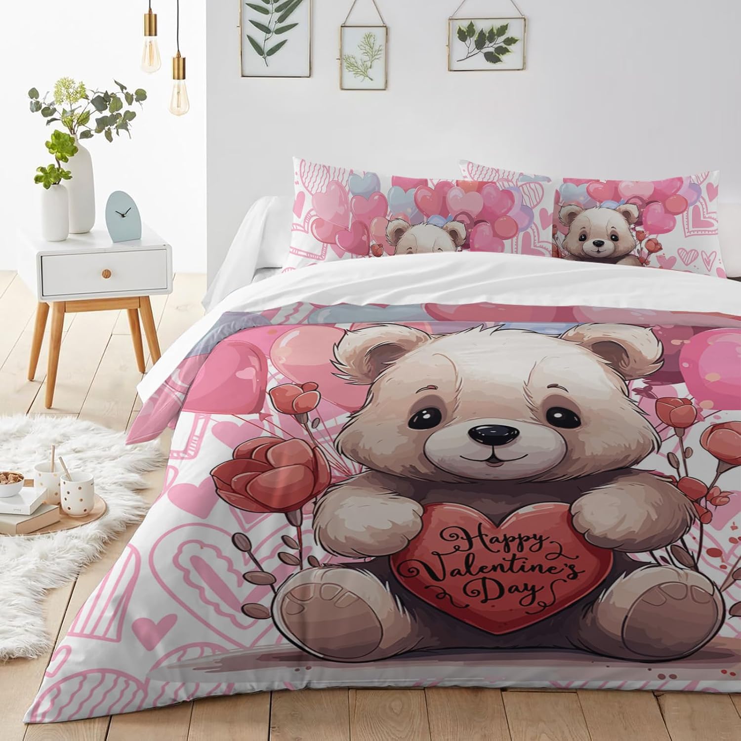 This Valentine comforter set brings a beautiful blend of romance and comfort to your bedroom. Designed with a charming bear pattern in soft pink and red, it's the perfect way to infuse your space with warmth and festive spirit during any season.