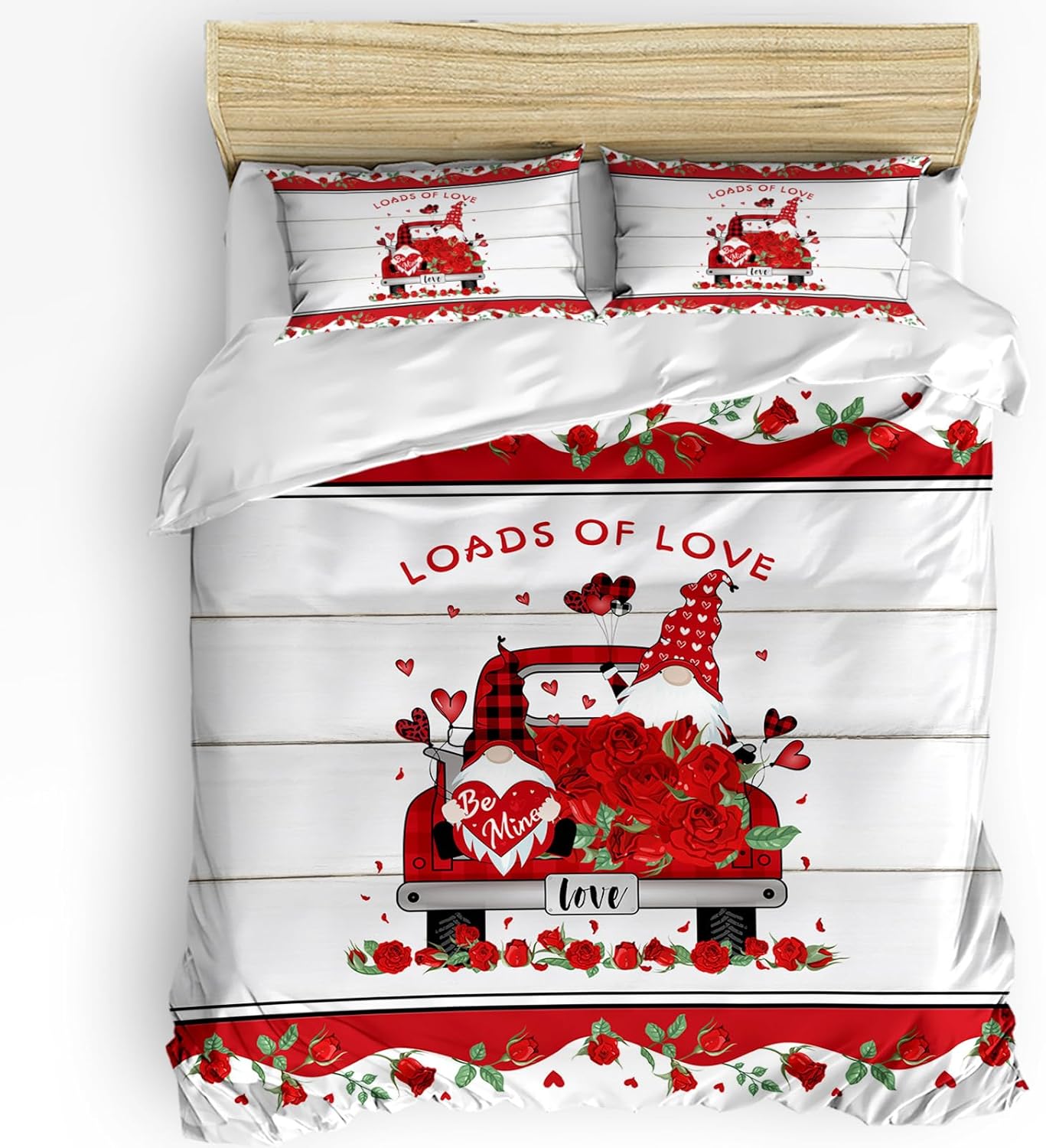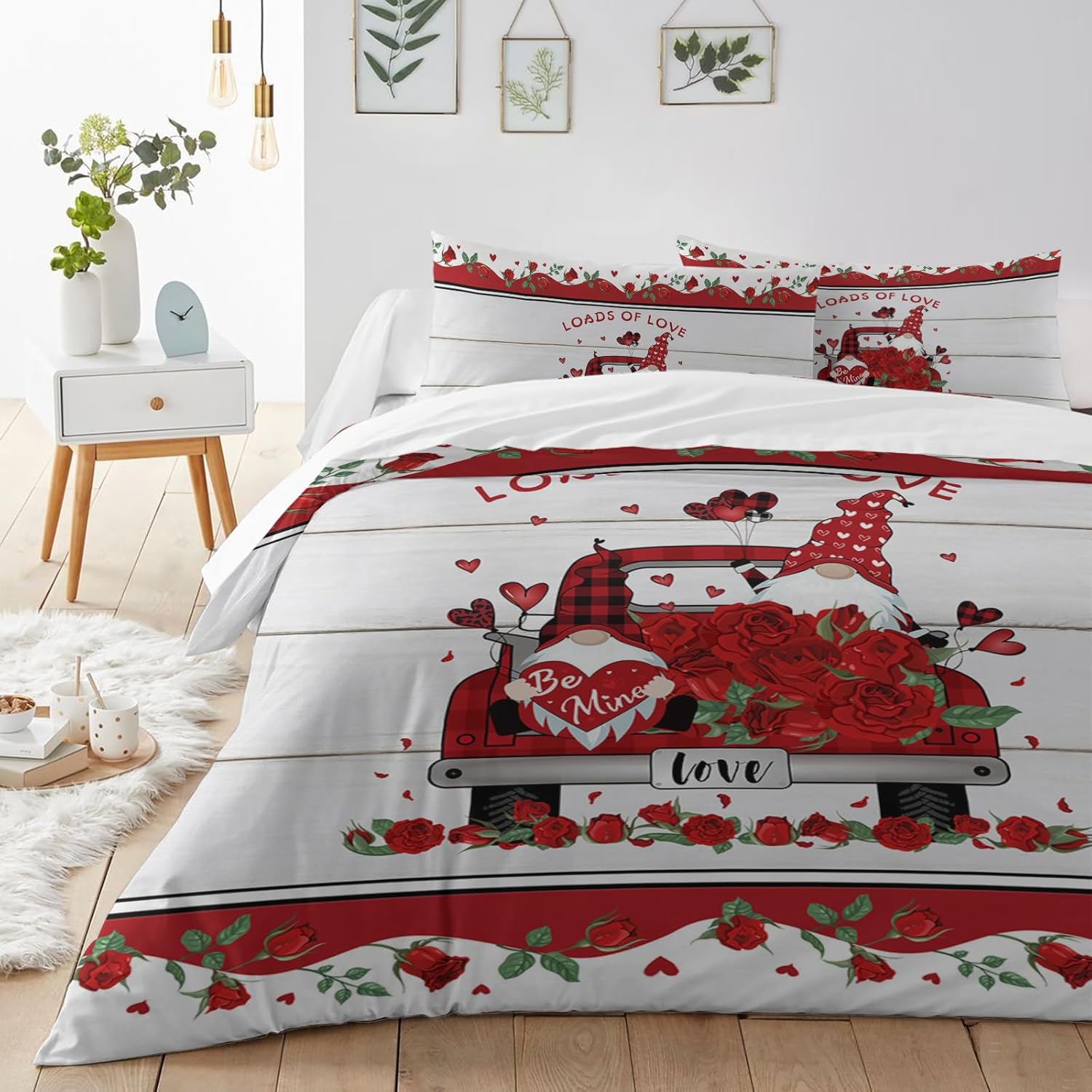 This Valentine comforter set brings a touch of whimsy and charm to your bedroom with its cozy design featuring gnomes, trucks, roses, and wood grain patterns. The elegant mix of colors and textures creates a warm and inviting atmosphere, perfect for making your space feel special and festive. Whether you're setting the mood for a romantic evening or a cozy night in, this set adds a delightful twist to your everyday relaxation.