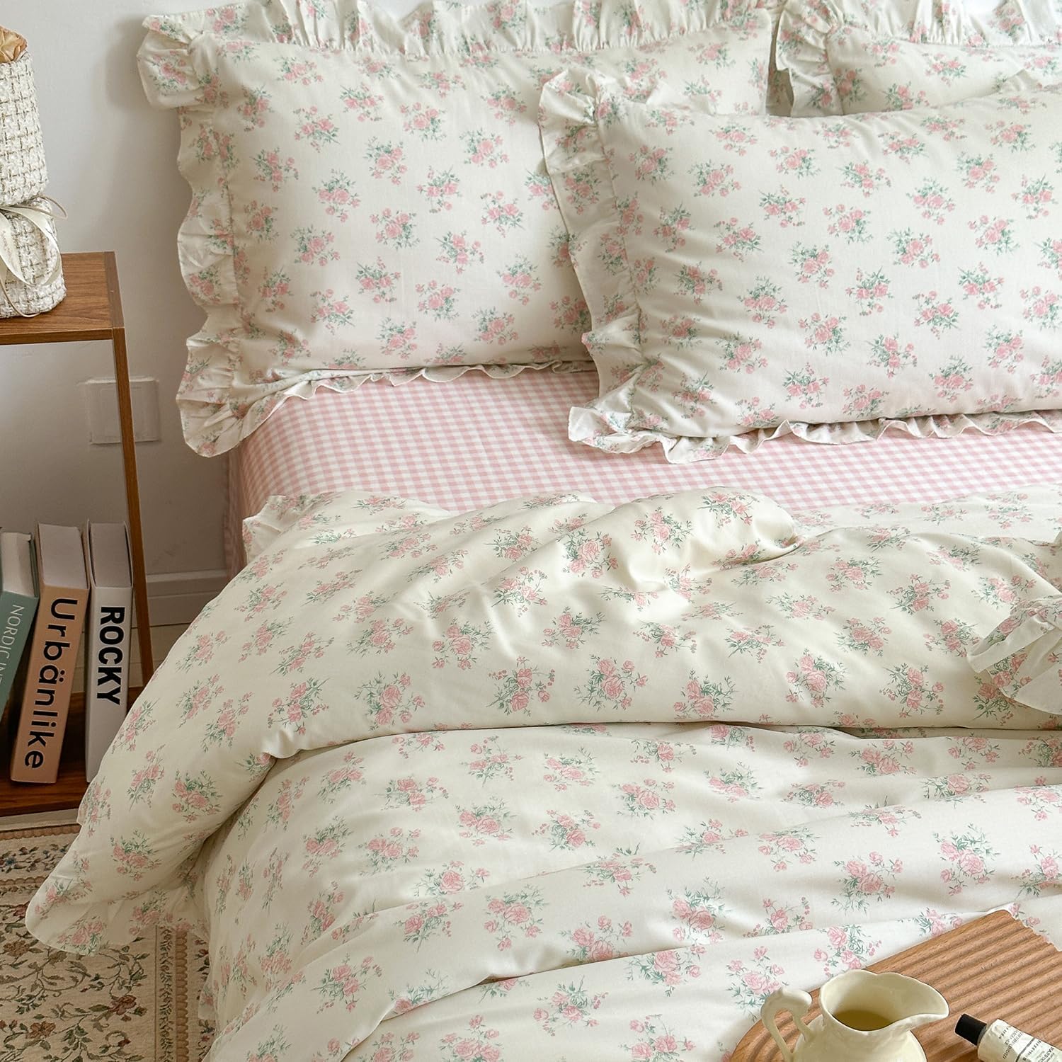 This beautiful duvet cover set is made from 100% soft cotton, offering a luxurious and breathable feel thatâs perfect for any season. Designed with a charming pink blossom pattern, it brings a touch of elegance and whimsy to your bedroom. The ruffled edges add a vintage and cottagecore-inspired touch, making your space feel warm and inviting.