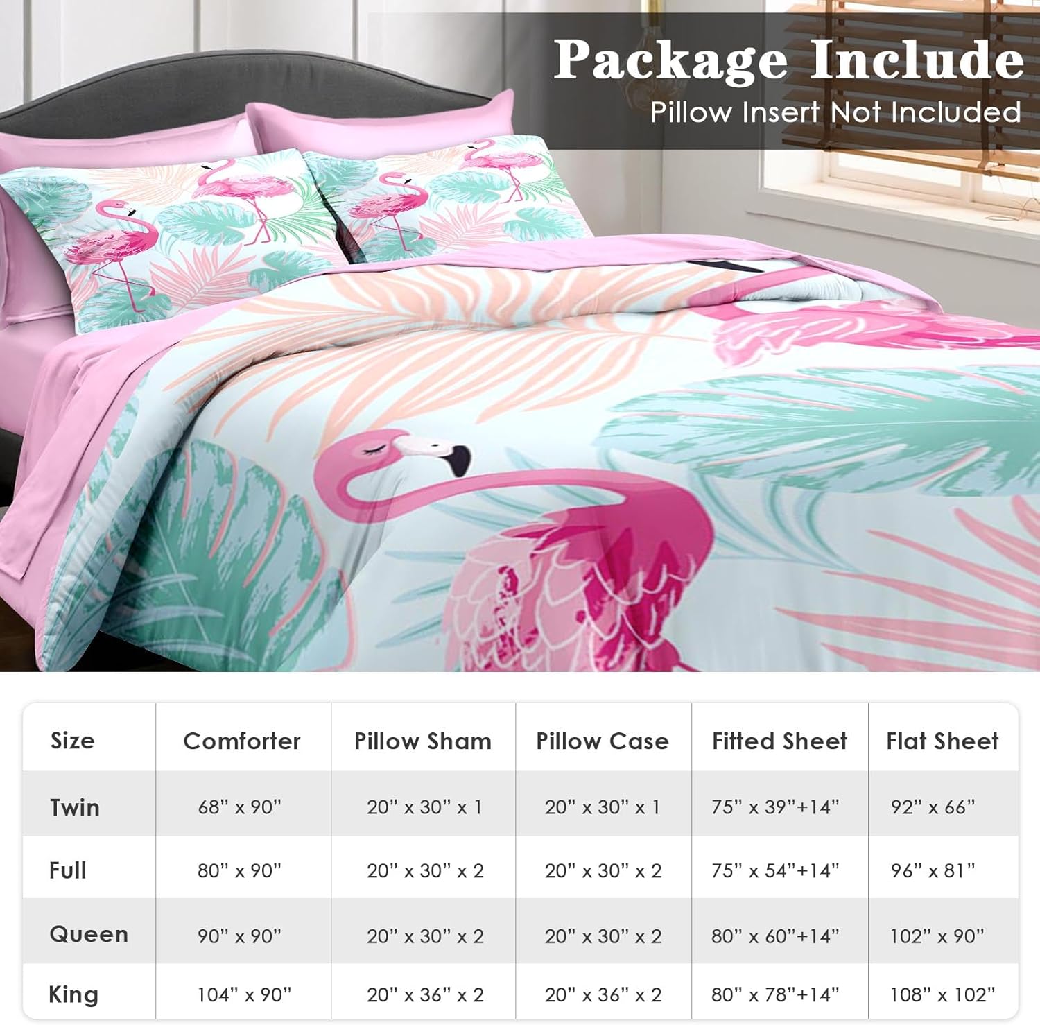 This set includes a comforter, flat sheet, fitted sheet, two pillowcases, and two shams, giving you a complete and coordinated look. The deep-pocket fitted sheet fits most mattresses securely, and the elastic band ensures it stays in place the whole night through.