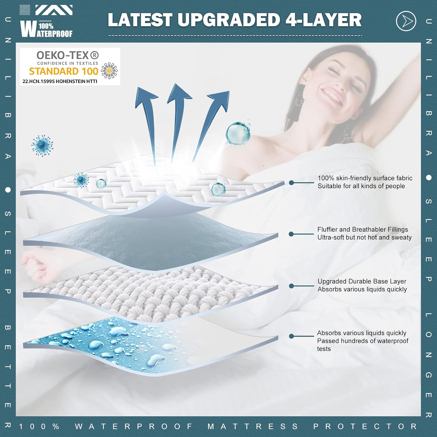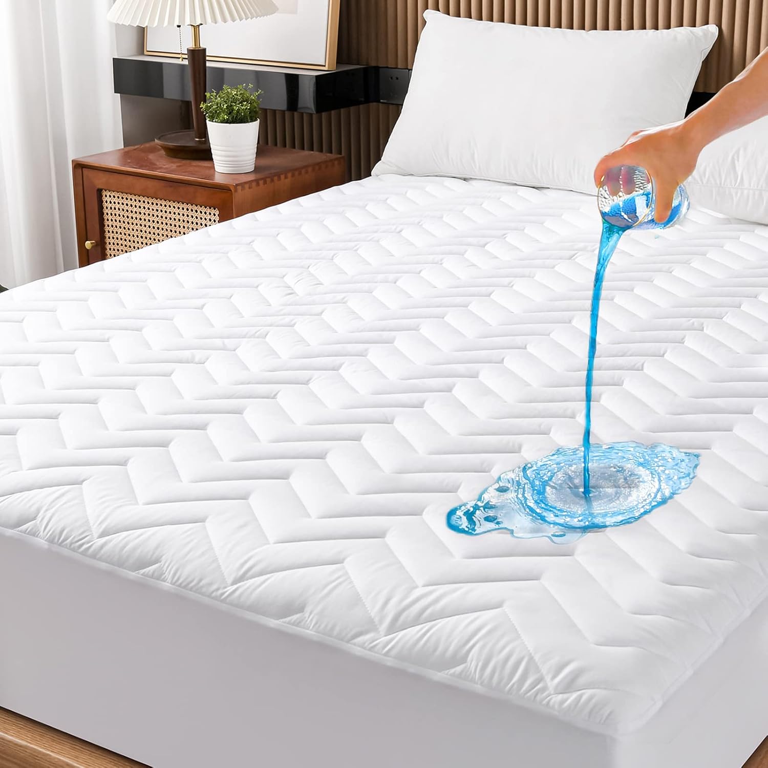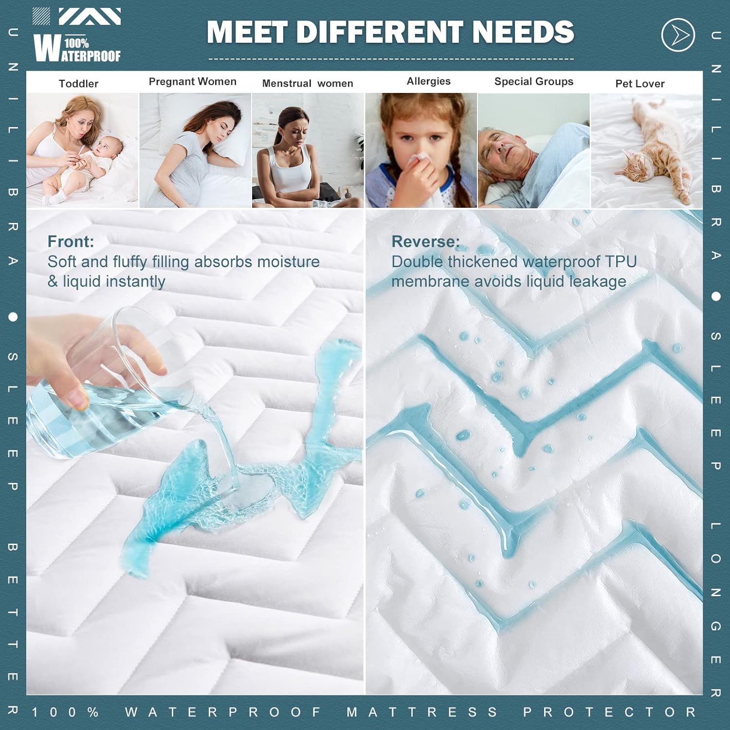Keep your sleep safe and comfortable with our advanced waterproof mattress protector designed for all your needs. Perfectly crafted for 6''-25'' mattresses, it offers a deep pocket fit and ultra-soft comfort. Featuring a 100% TPU waterproof membrane, this protector provides leak-proof defense against spills, urine, and sweat. Itâs tested for reliability, ensuring your sleep environment stays dry and clean. Our quilted construction includes a double thickened breathable hollow cotton filling, offering a plush yet airy feel. It's ideal for sensitive skin and even safe for babies to use. With a deep pocket design, it accommodates a wide range of mattress thicknesses and keeps the protector firmly in place, preventing shifting for a stable and long-lasting fit. This machine washable mattress protector combines practicality with ease of care. Simply toss it in the washing machine to keep it fresh and extend its usage over time. Whether you're looking for a waterproof mattress pad, a breathable quilted mattress pad, or a deep pocket mattress cover, this protector is the perfect choice for anyone who values cleanliness and comfort.Unilibra Queen Size Waterproof Mattress Protector