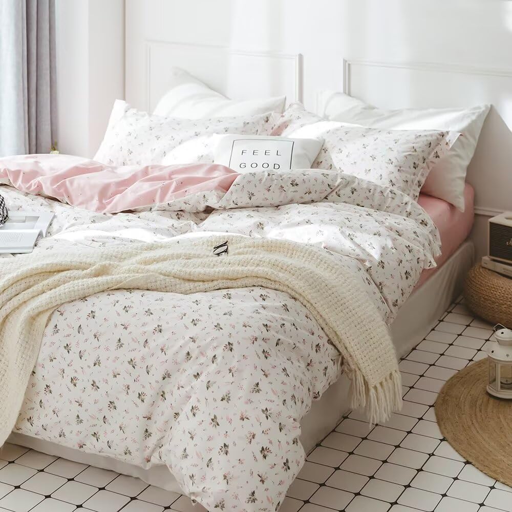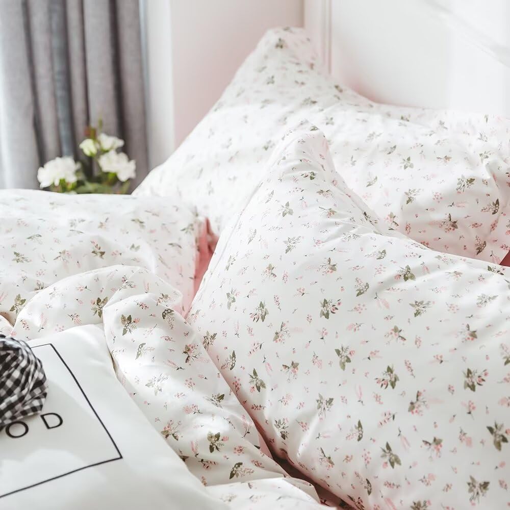The vintage-inspired floral pattern combines pink and white botanical elements to create a charming, versatile look. This design is ideal for everyday use or special occasions, transforming your bedding into a stylish centerpiece that complements any interior decor.
